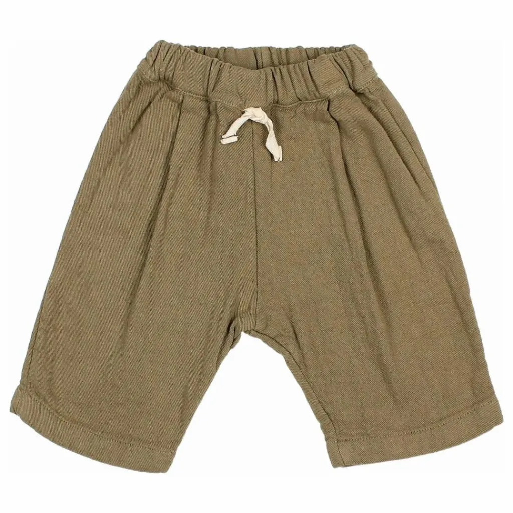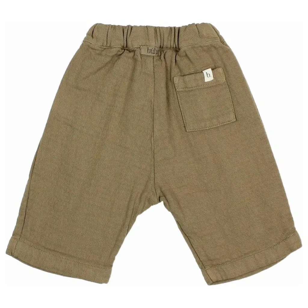 - Pantalon en sergé de coton doux. Taille élastique avec cordon décoratif et pinces. Poche Plastron avec étiquette au dos.
