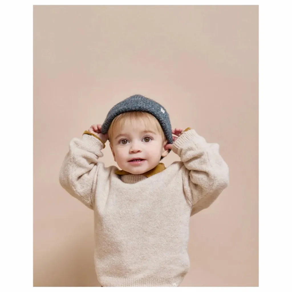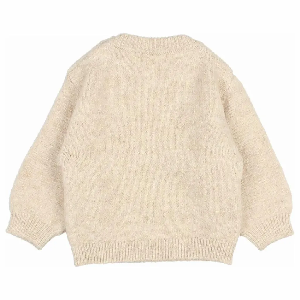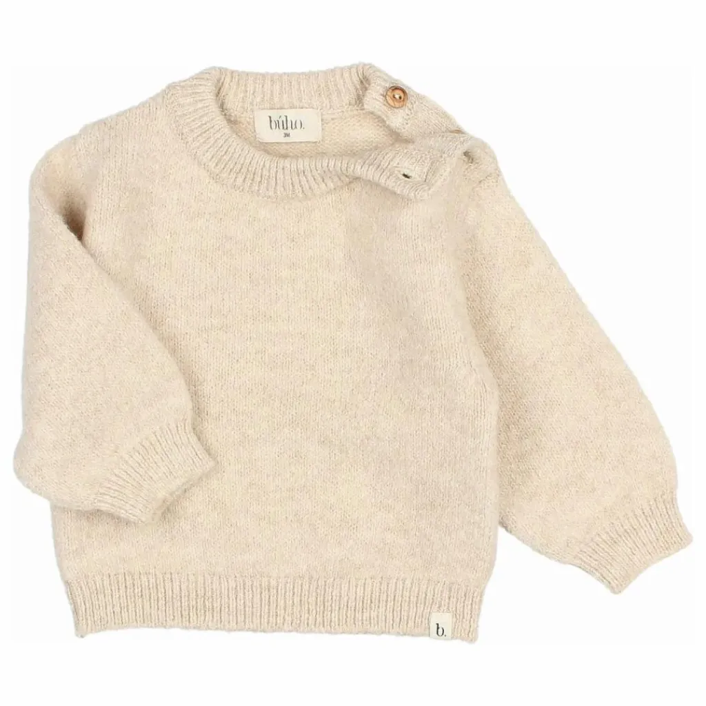 - Pull en maille mélangée. Col rond avec fermeture à bouton. Poignets et ourlets côtelés. Étiquette sur l’ourlet.