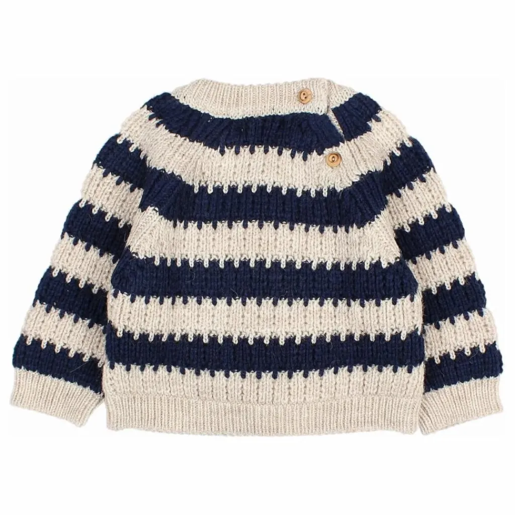 - Pull en maille rayée. Col rond avec ouverture boutonnée dans le dos. Manches raglan. Finitions côtelées. Étiquette sur l’ourlet.