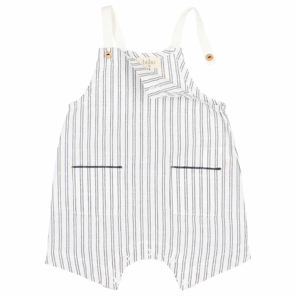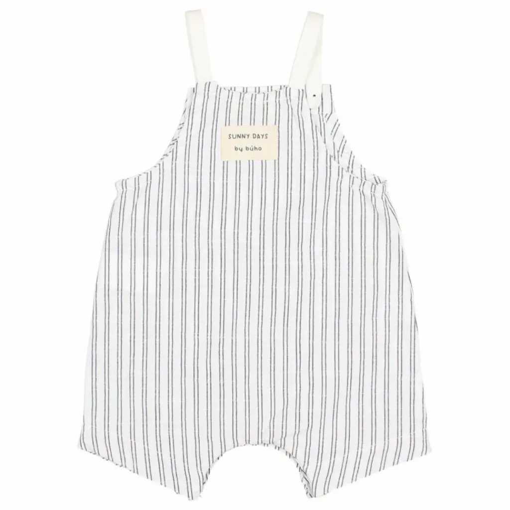 - Salopette rayée avec poches. Col droit. Bretelles croisées avec fermeture boutonnée sur le devant. Etiquette décorative au dos. Boutons-pression à l’entrejambe pour faciliter l’habillage.
