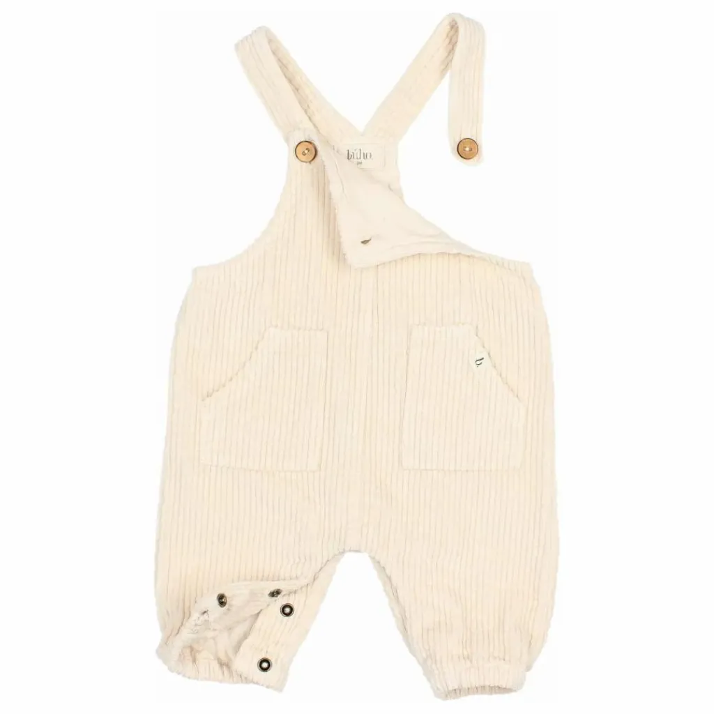 - Longue salopette en velours côtelé. Bretelles croisées avec fermeture par bouton en bois sur le devant. Poches plaquées sur le devant avec étiquette. Boutons-pression à l’entrejambe pour faciliter l’habillage. Bas élastiqué.