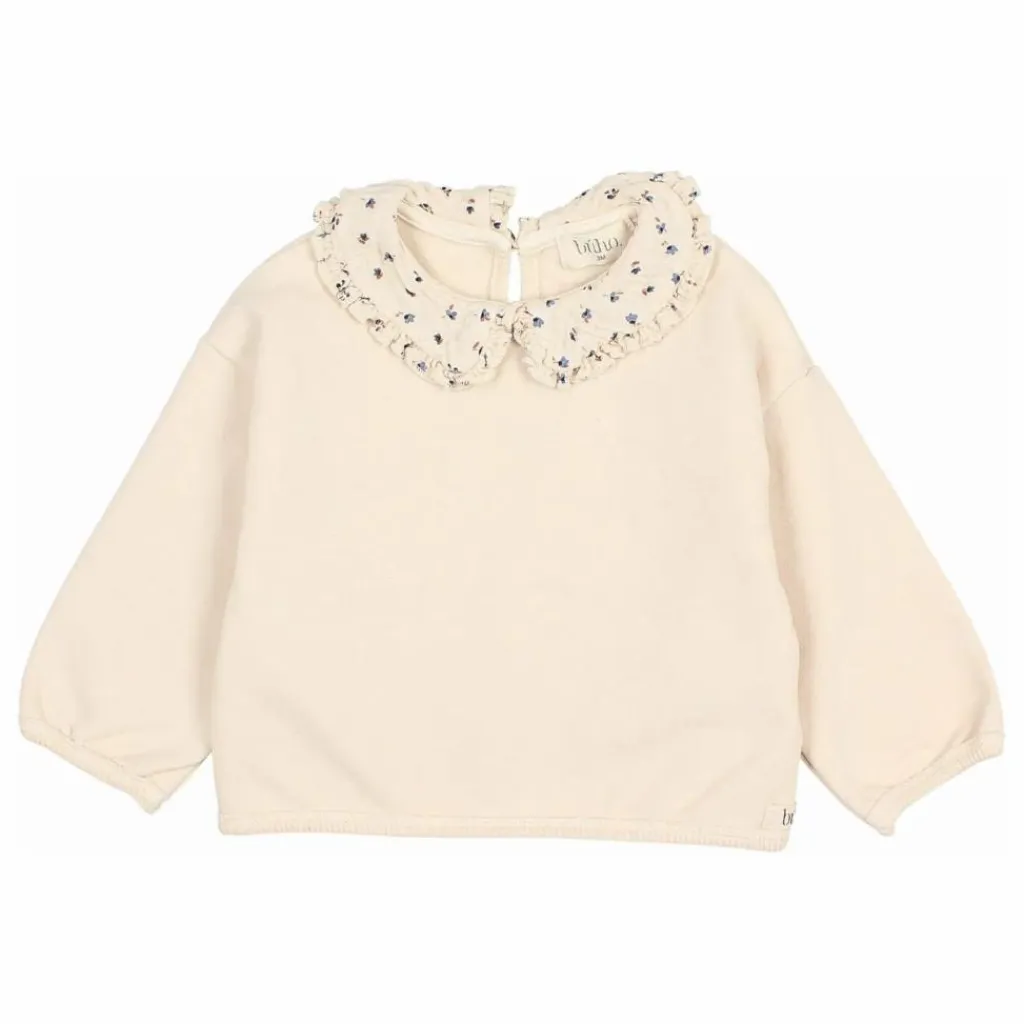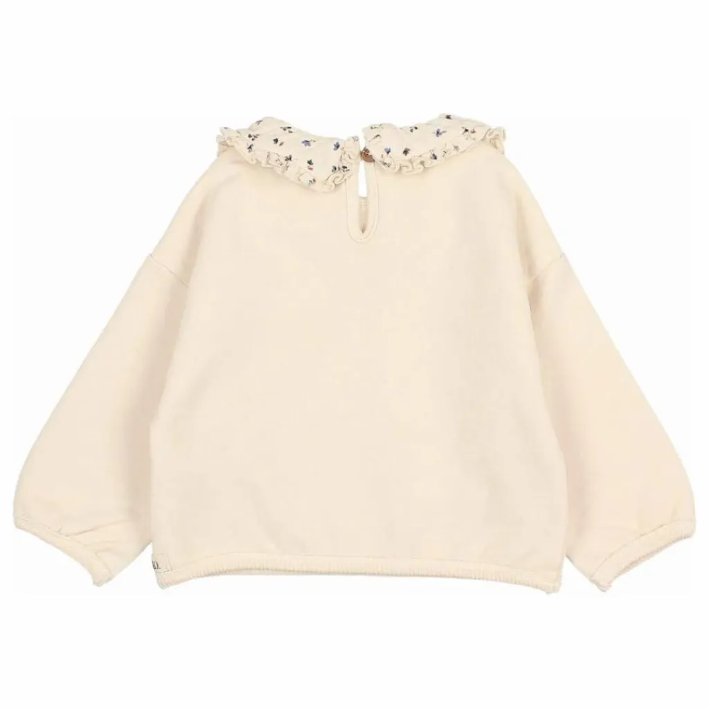 - Sweat-shirt en laine polaire. Col bébé en mousseline avec imprimé « fall ». Fermeture en goutte d’eau avec bouton en bois au dos. Poignets et ourlet élastiqués.