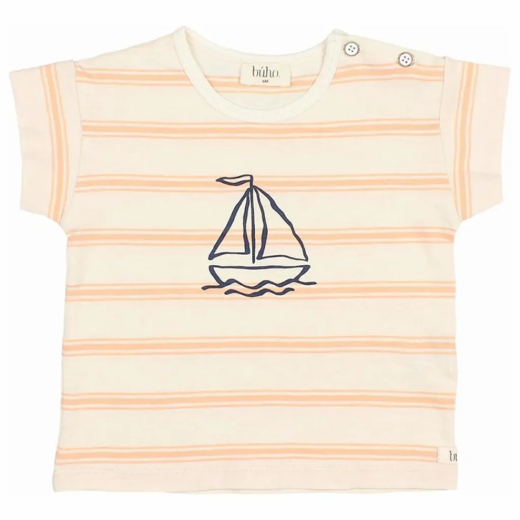 - T-shirt rayé avec impression sur le devant. Col rond avec fermeture à bouton sur l’épaule. Manches courtes.