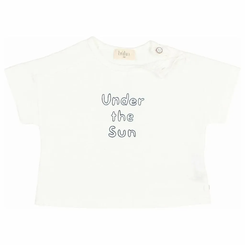 - T-shirt à manches courtes avec impression de soleil sur la poitrine. Col rond avec ouverture à bouton sur l’épaule.
