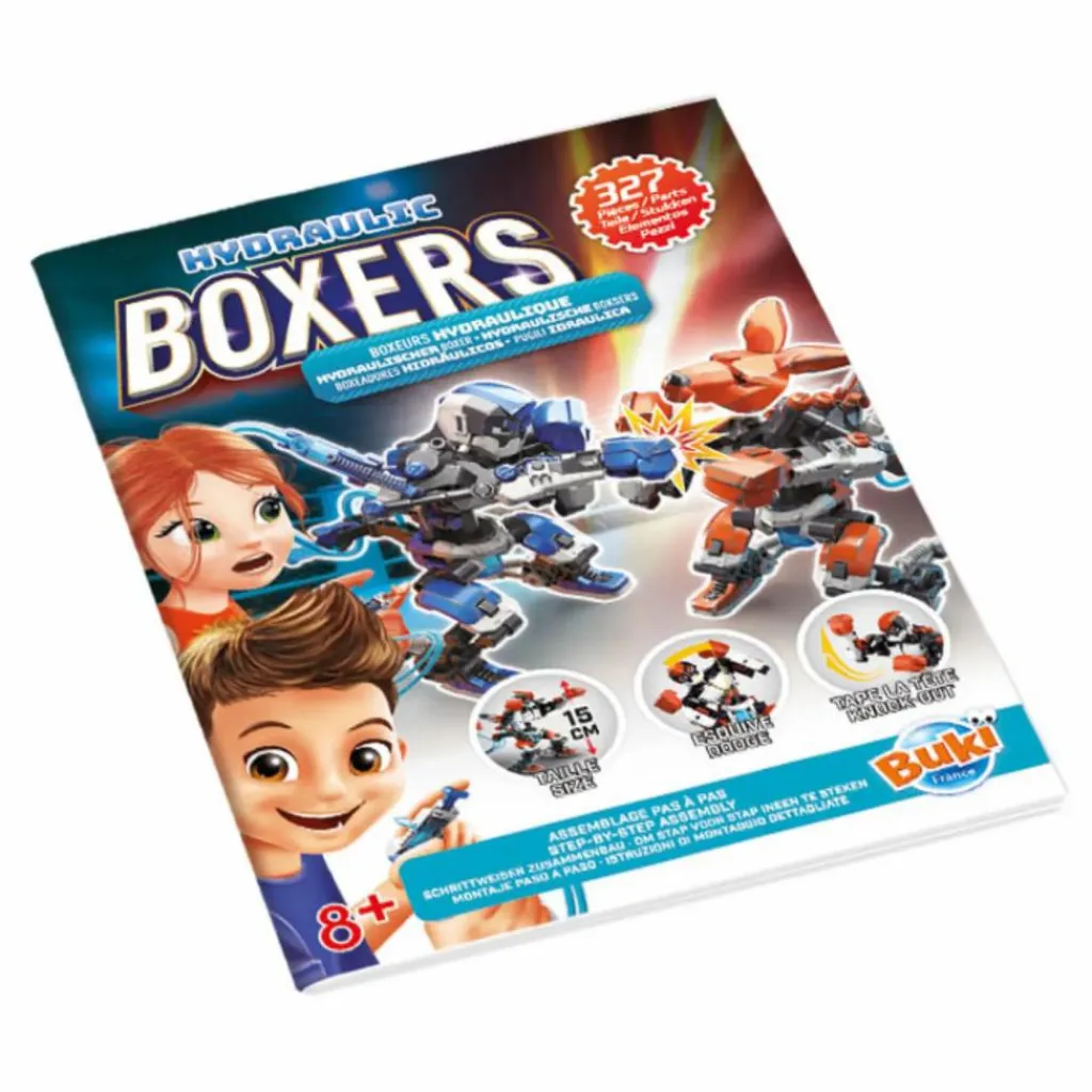 Deux boxeurs à assembler qui fonctionnent à l’énergie hydropneumatique. Vos enfants utilisent les manettes pour les articuler : crochet, uppercut, contre et esquive. Un coup bien placé permet de faire sauter la tête de son adversaire.