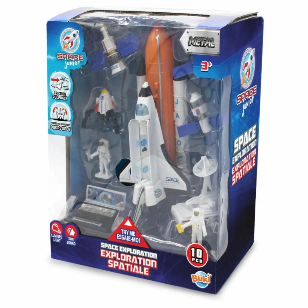 Un set complet sur le thème de l’espace pour des heures de jeu ! La navette spatiale est en métal. Son système à friction permet de la faire rouler vite ! Ses portes s’ouvrent et lorsqu’on appuie sur le bouton noir, lumière et son de décollage s’activent.