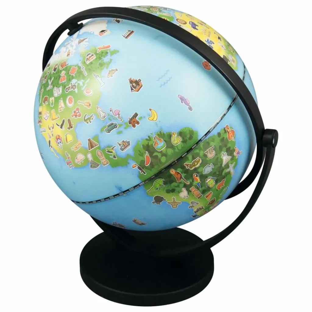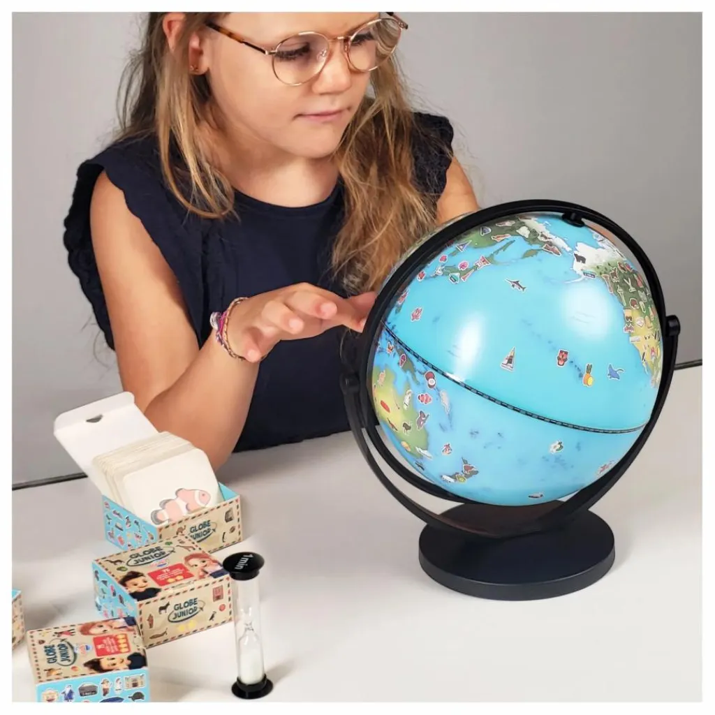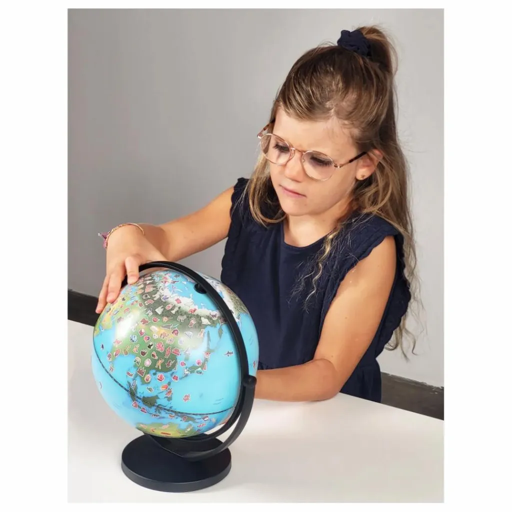 - Un globe illustré de 20 cm qui tourne dans tous les sens pour initier l’enfant à la découverte du monde. La carte comporte plus de 300 dessins : animaux, monuments, sports, plats culinaires…
