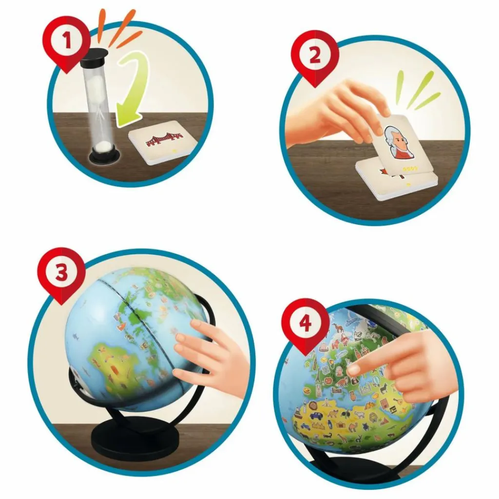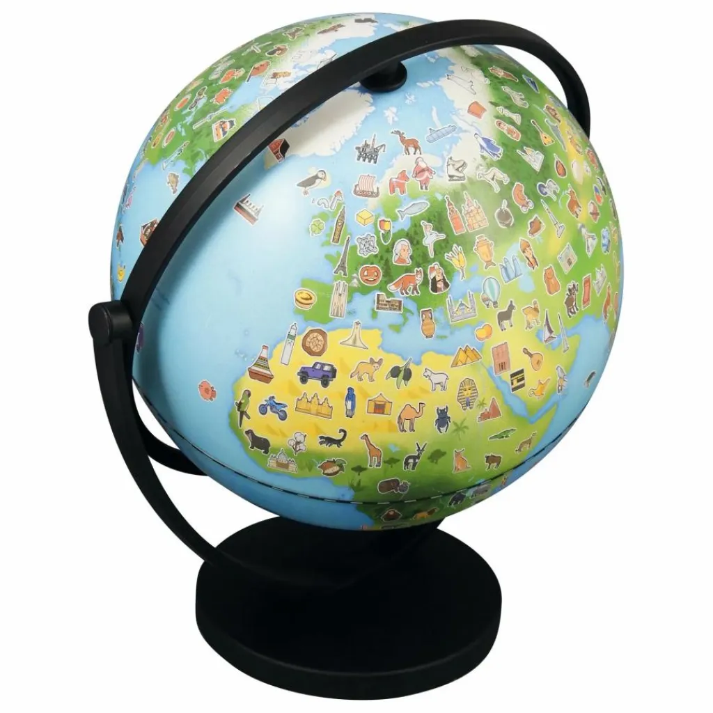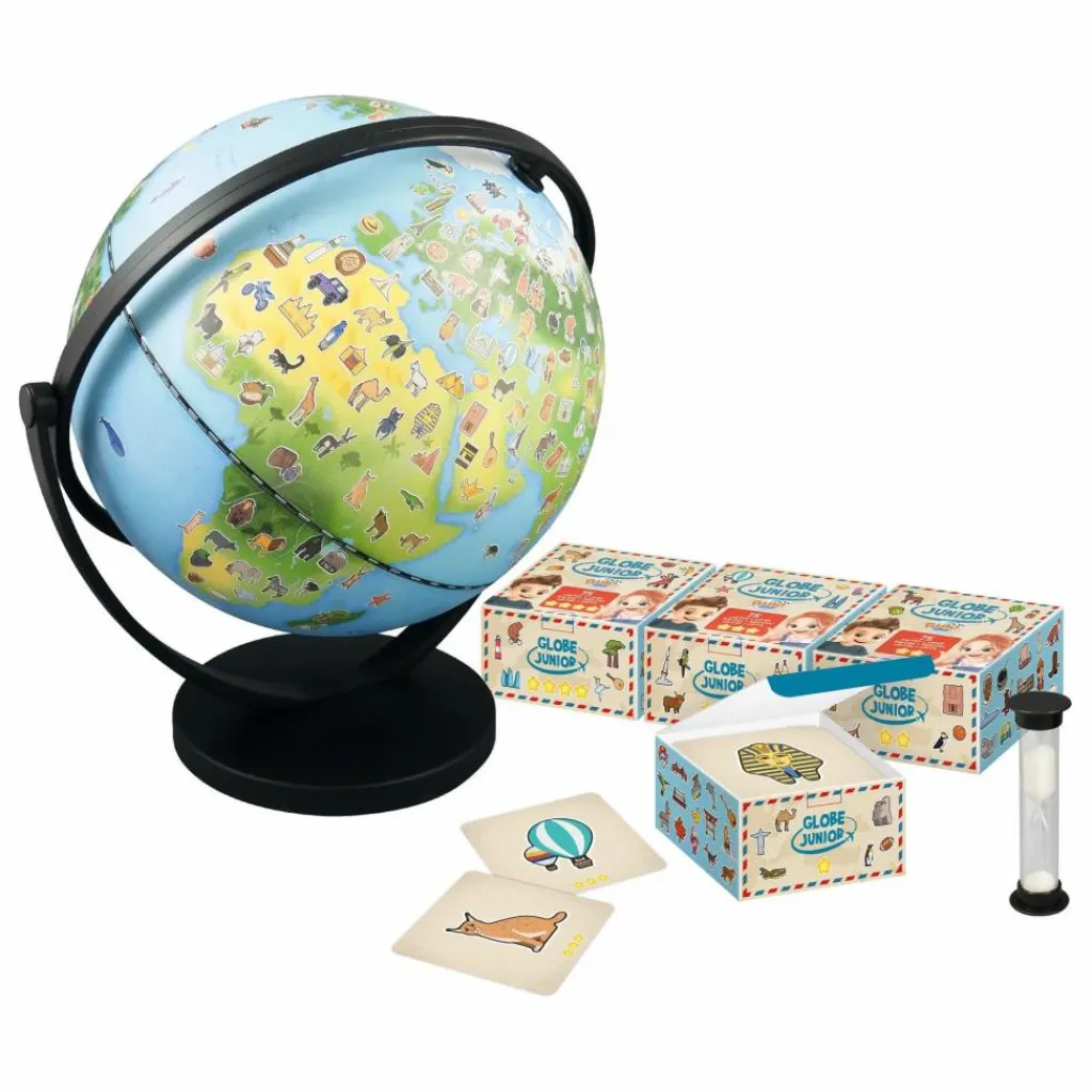- Un globe illustré de 20 cm qui tourne dans tous les sens pour initier l’enfant à la découverte du monde. La carte comporte plus de 300 dessins : animaux, monuments, sports, plats culinaires…