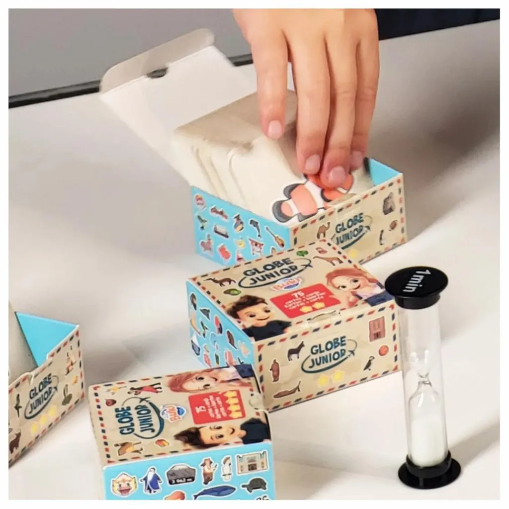 L’enfant tire une des 300 cartes, observe le dessin, retourne le sablier et doit retrouver le dessin avant que le sablier ne se soit écoulé. Au dos de chaque carte, l’enfant découvrira une anecdote ou une information.