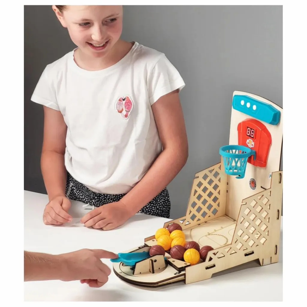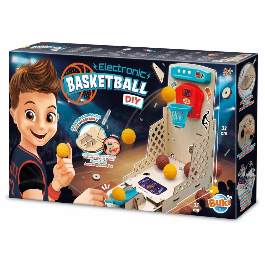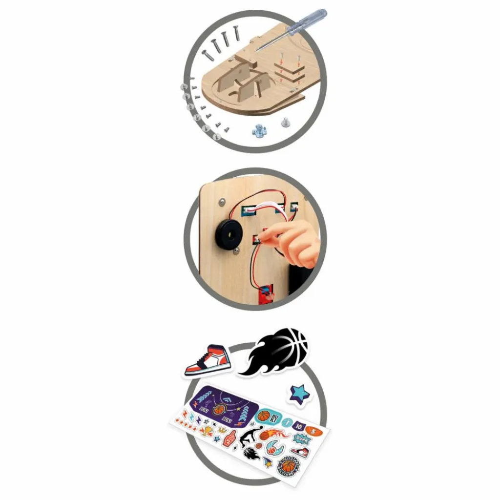- Un coffret pour monter son panier de basket électronique. Avec le tournevis inclus, l’enfant va assembler sans soudure et sans danger: le tableau des scores, le panneau de contrôle, le haut-parleur et le compartiment à piles. Personnalise le panier avec les autocollants.