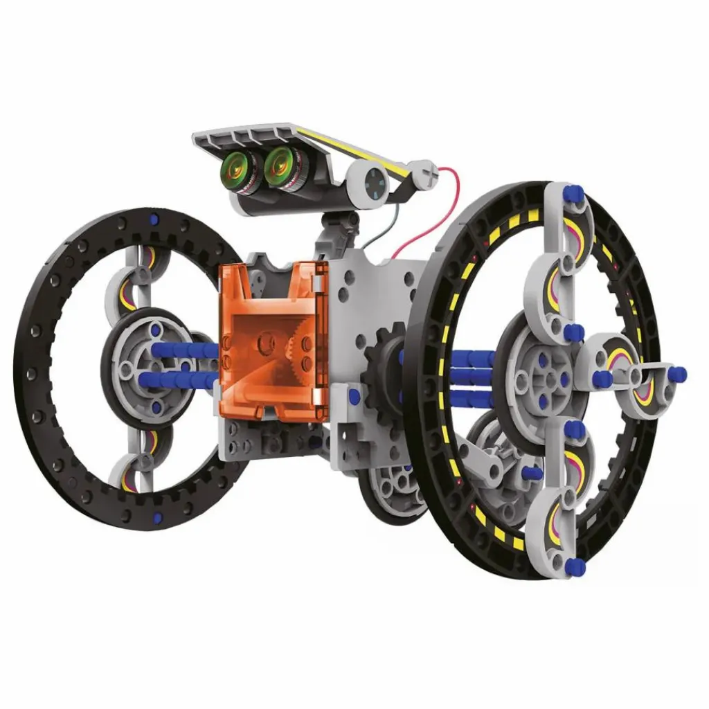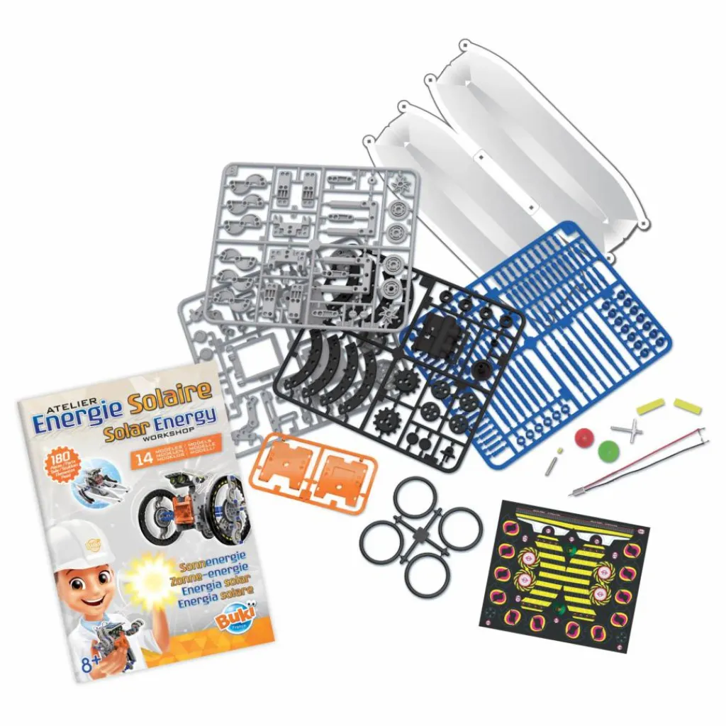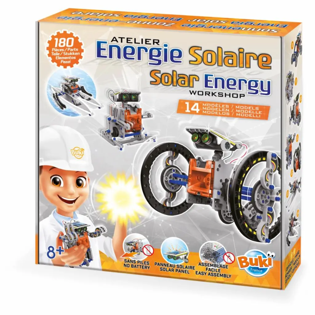 Deviens un pro des énergies solaires avec ce super kit ! Assemble les différentes pièces afin de construire un à un les 14 véhicules qui avancent grâce à l’énergie solaire ! Le panneau capte les rayons du soleil ou d’une lampe d’au moins 50W pour les transformer en courant électrique.