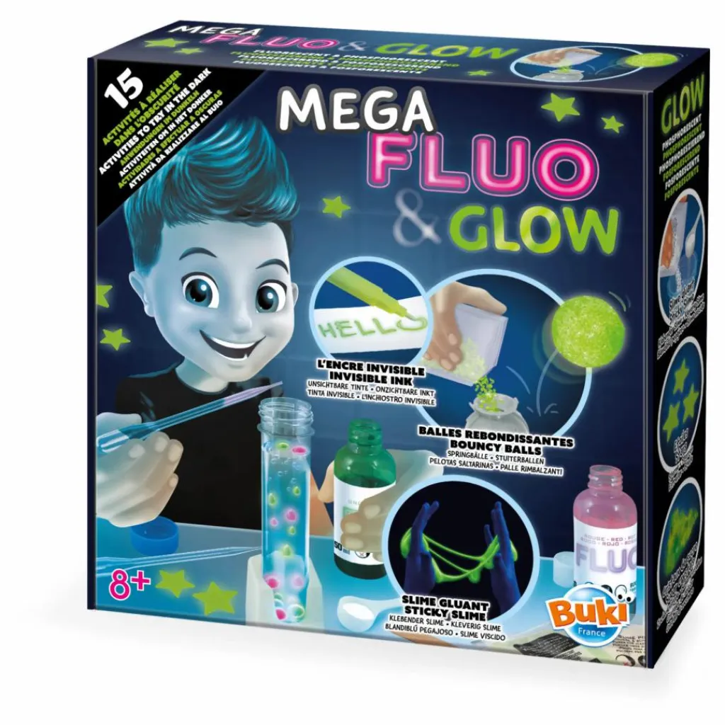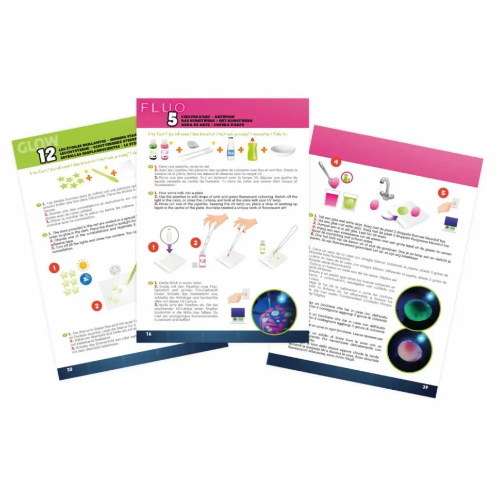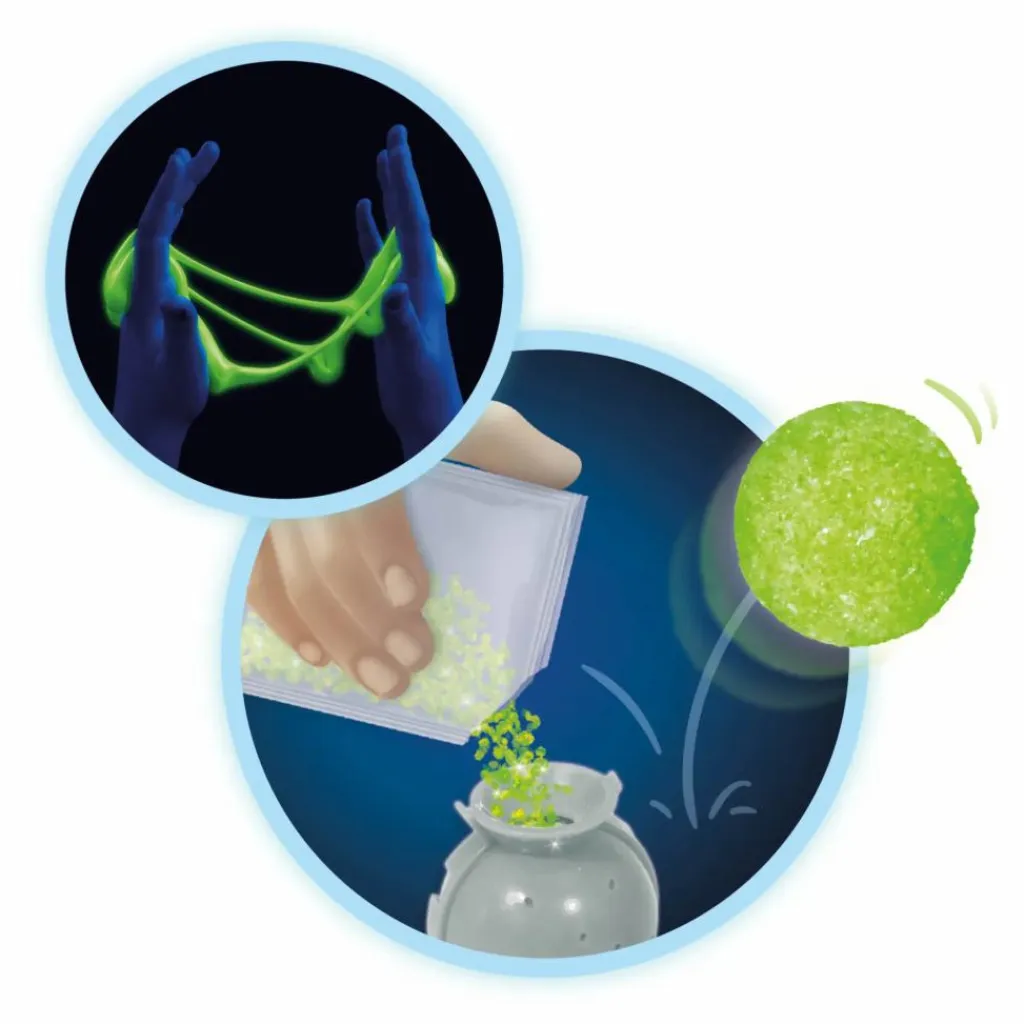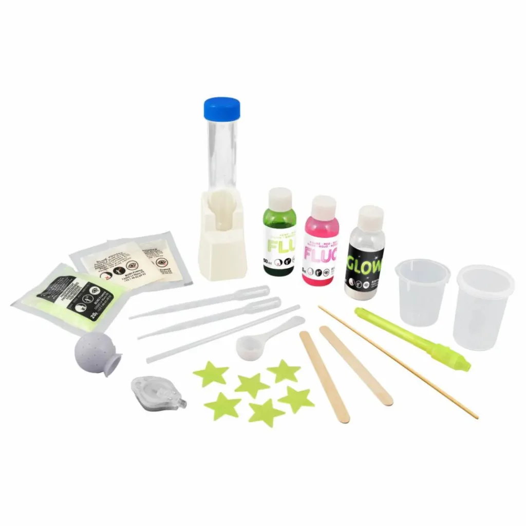 - 1 tube à essai, support, 1 lampe UV, 2 mélangeurs en bois, 1 bâton en bois, 2 pipettes, 1 paille, 1 gobelet mesure (50 ml), 1 récipient avec couvercle, 1 cuillère mesure, colorant Rose Fluorescent (50 ml), Colorant Vert Fluorescent (50 ml), Poudre phosphorescente (60 g), étoiles phosphorescentes, Poudre à slime (2 sachets), poudre à balles rebondissantes (1 sachet), 1 moule à balle, stylo UV, 1 notice illustrée.