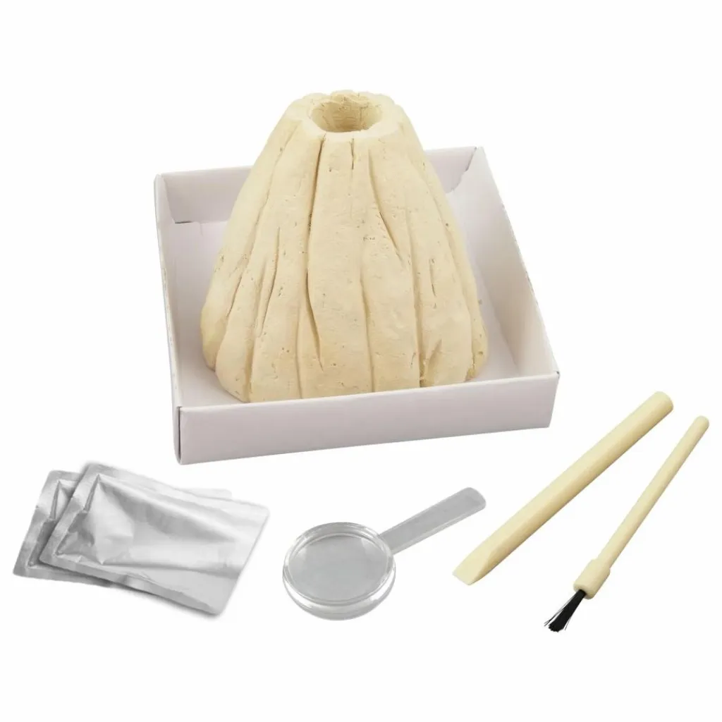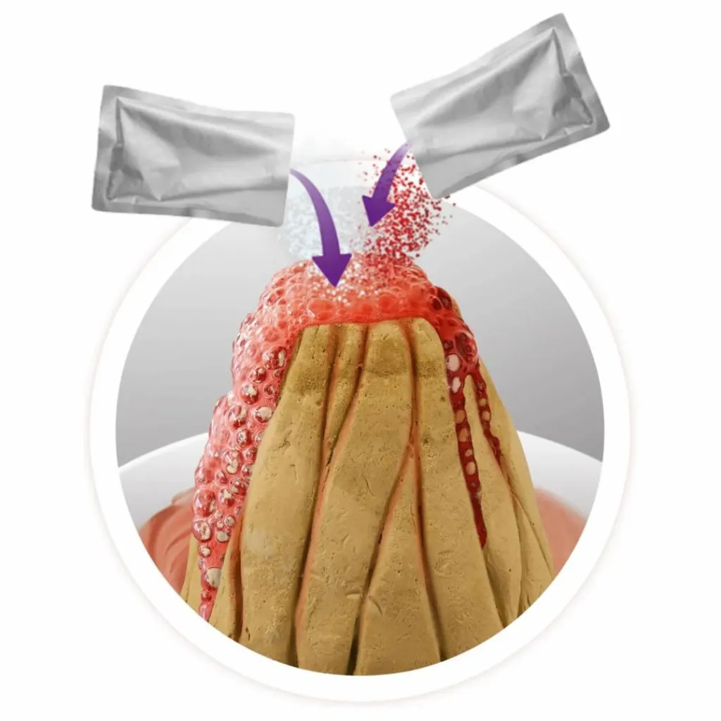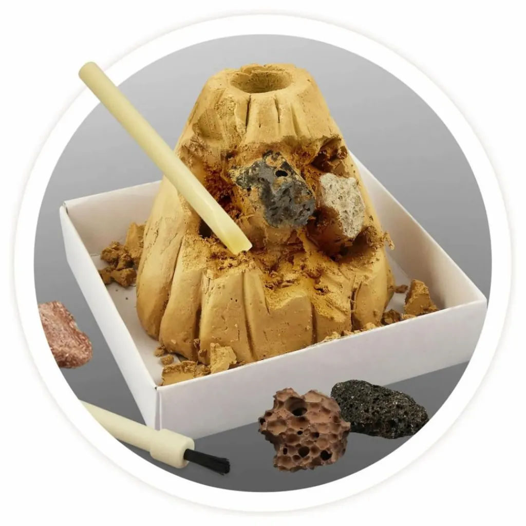 - Reproduis une éruption volcanique avec les réactifs inclus. Avec les outils, creuse le volcan pour déterrer 5 pierres volcaniques.