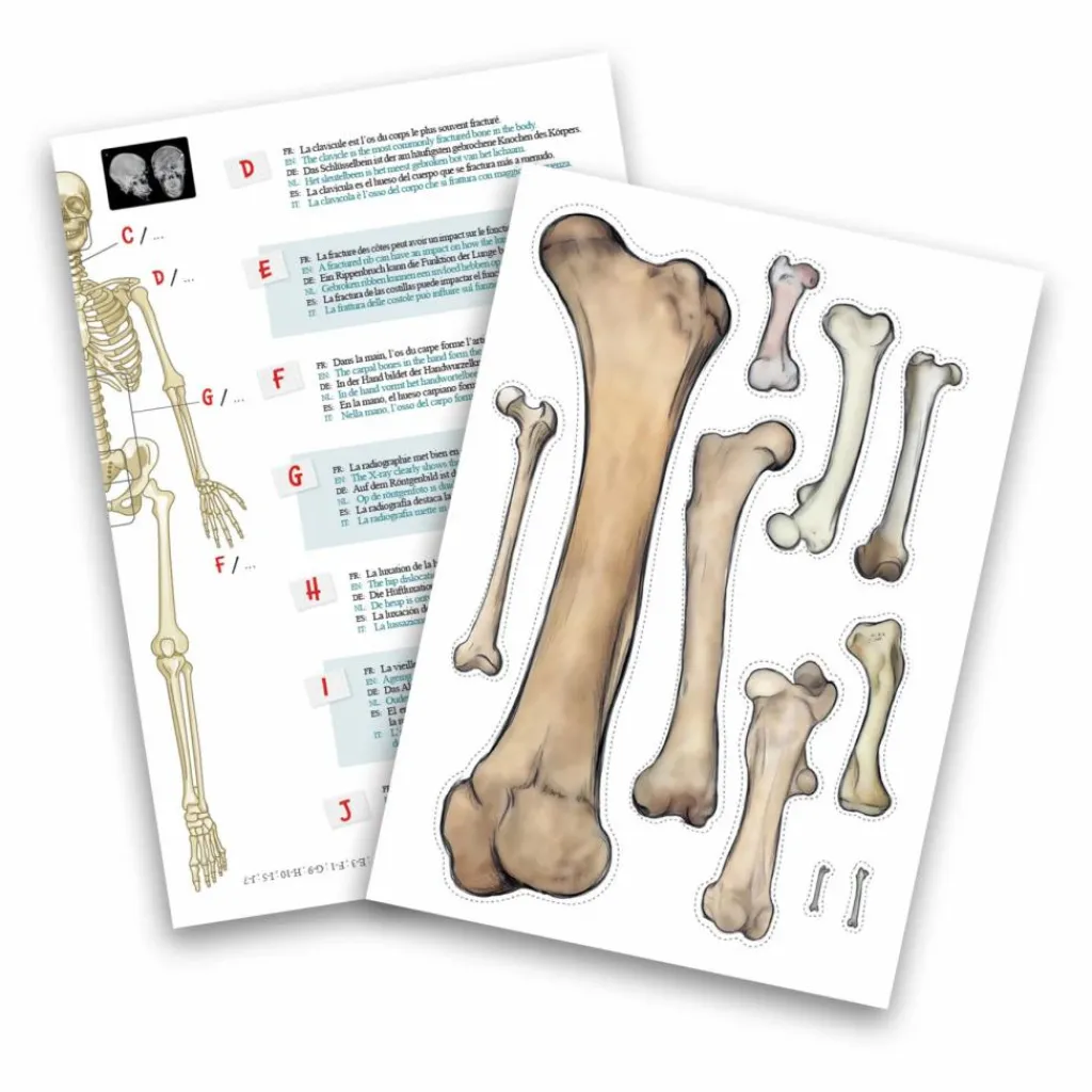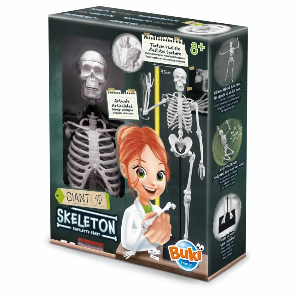 Un squelette de 45 cm à assembler pour découvrir l’anatomie ! Les os ont une texture et des couleurs réalistes. Le squelette est entièrement articulé et l’enfant peut le placer dans différentes positions. Une base est fournie pour l’installer sur un bureau. Votre enfant place des étiquettes sur les os pour les identifier et il peut observer les radiographies incluses.