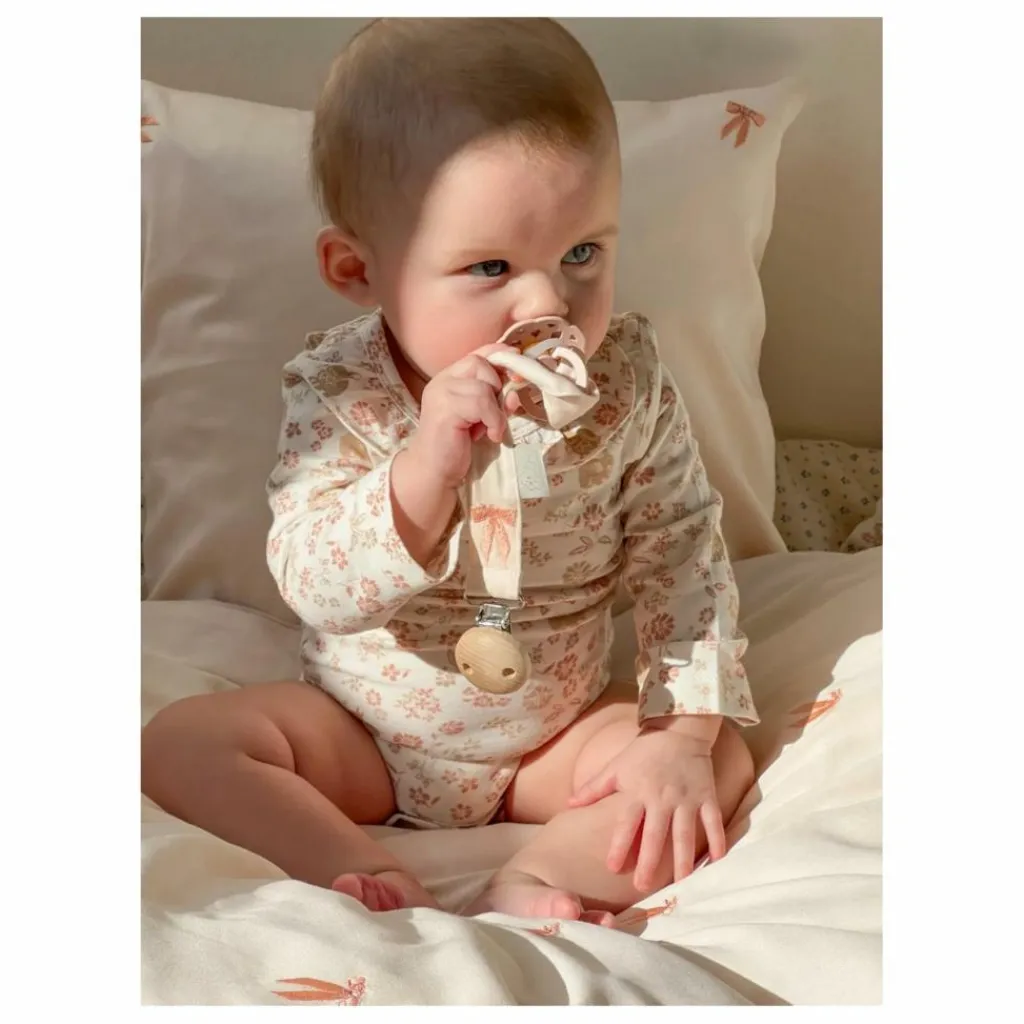 - Gardez la sucette de votre bébé à portée de main et non sur le sol grâce à notre attache-sucette brodée au motif de nœuds romantiques. Fabriqué en coton biologique certifié GOTS, ce charmant porte-sucette est orné d’une délicate broderie de nœuds roses. L’attache sécurisée se fixe facilement aux vêtements de votre bébé, garantissant que la sucette reste propre et à portée de main. Le porte-tétine Bows allie fonctionnalité et fantaisie, ce qui en fait un accessoire pratique et élégant pour votre enfant.
