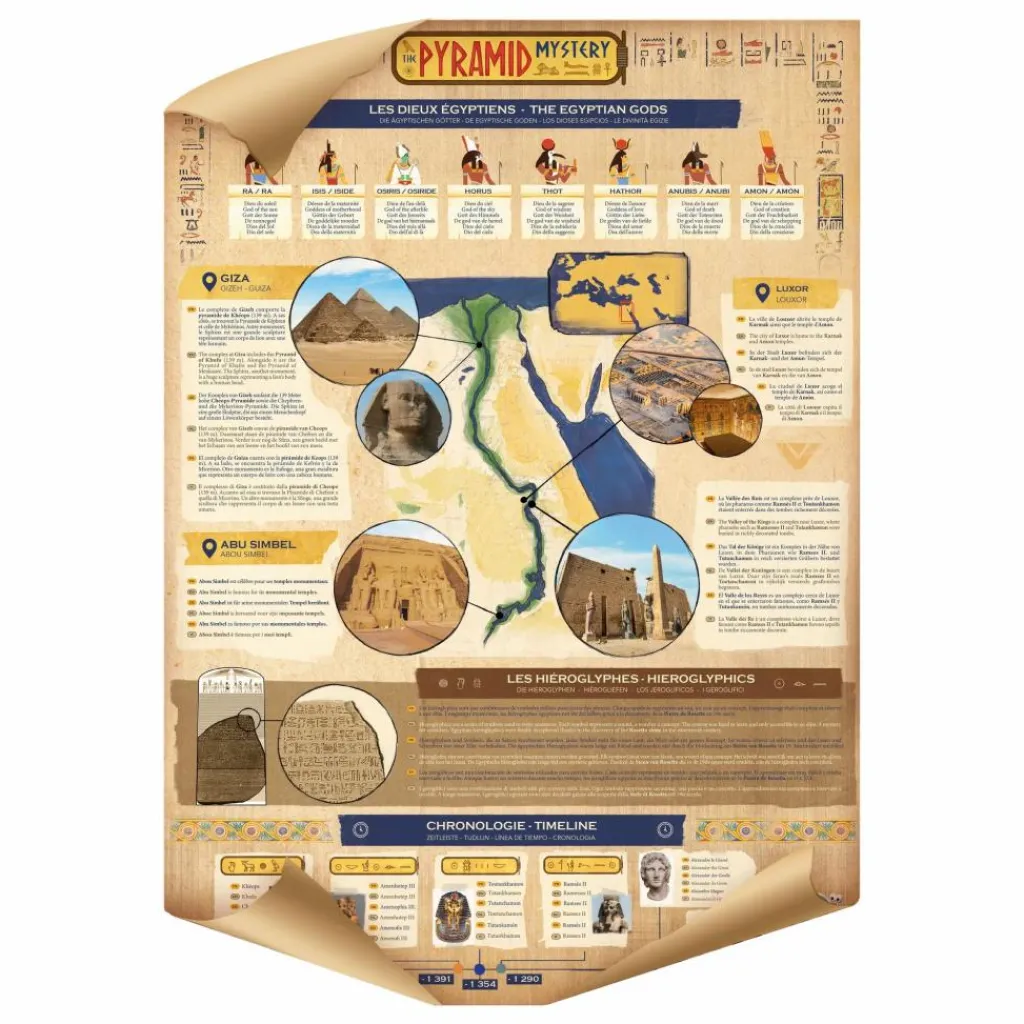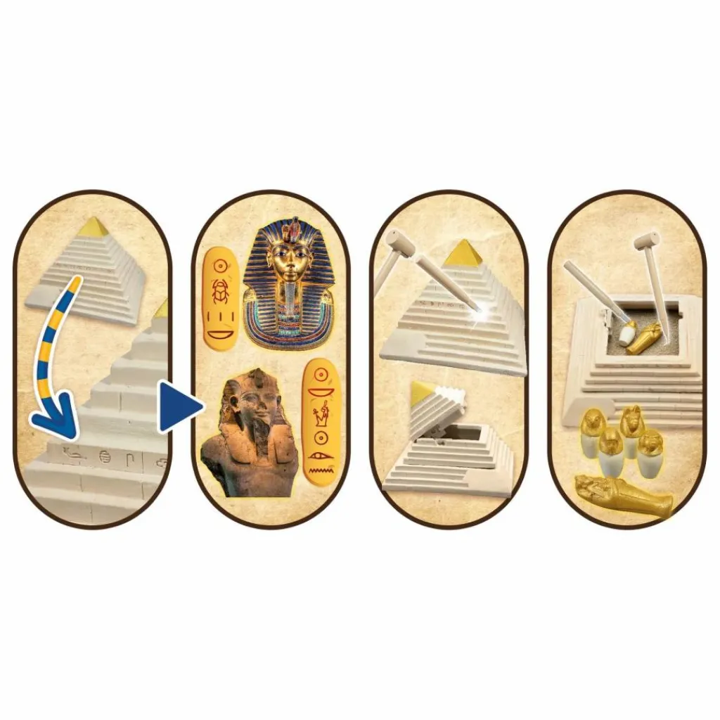 - Déchiffre les hiéroglyphes gravés sur les 4 faces et trouve le mécanisme secret pour ouvrir la pyramide. Une fois ouverte, déterre 5 trésors d’Egypte antique avec les outils inclus. Expose ta pyramide et les trésors dans ta chambre.