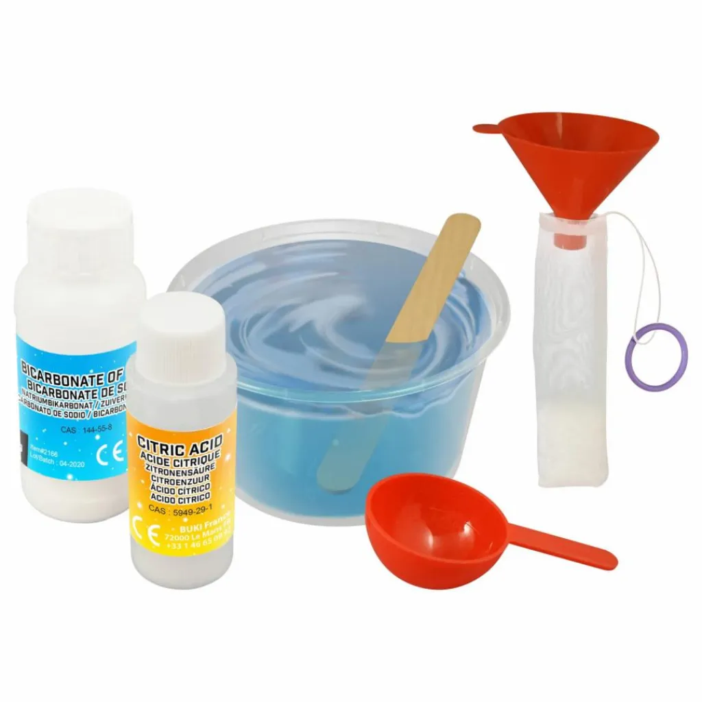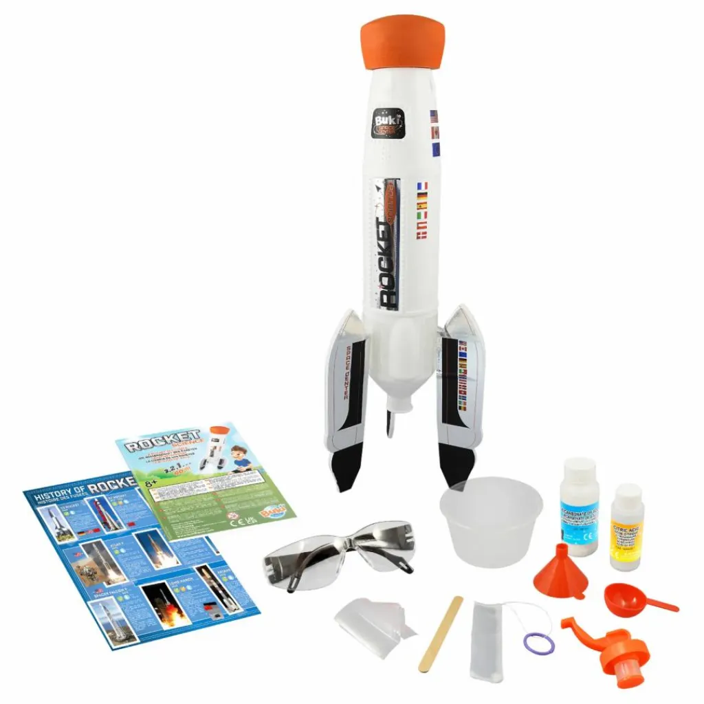- 1 fusée, 1 bouchon de sécurité, 1 filtre, 3 ailerons en mousse, 3 supports pour ailerons, des adhésifs double face, de l’acide citrique, bicarbonate de soude, cuillère mesure, mélangeur, entonnoir, bol, autocollants, poster, lunettes de protection.