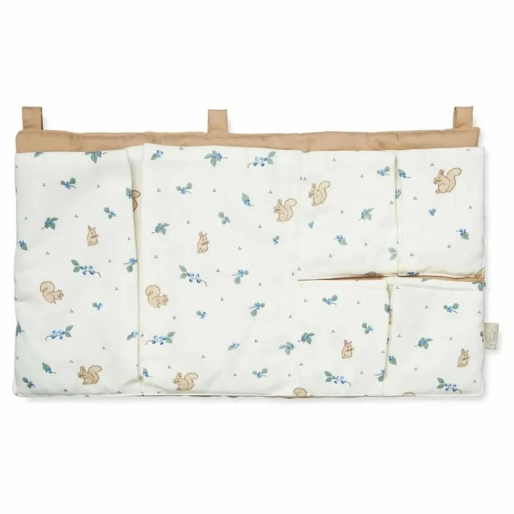 - Une jolie pochette de rangement pratique à installer sur un lit d’enfant pour accueillir les tétines, livres, doudous et autres accessoires indispensables pour la nuit. Pochette de rangement pour lit dans les tons blancs et bruns.