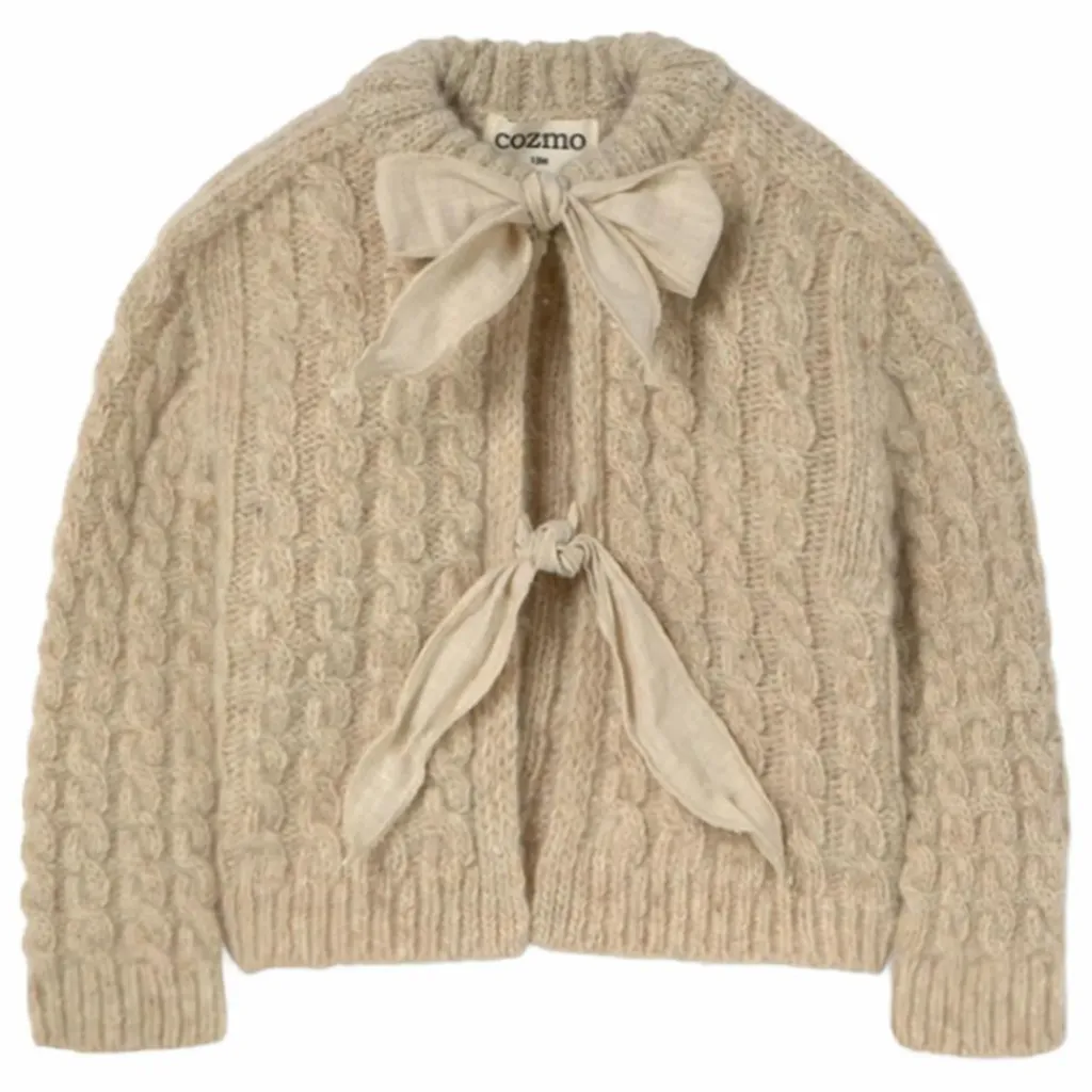 - Cardigan en tricot câblé doux, moelleux et chaud. Encolure arrondie. Bordures en côtes à l’encolure, aux poignets et à l’ourlet. Il se noue avec des nœuds sur le devant dans un tissu flanelle à imprimé floral. Subtilement moucheté.