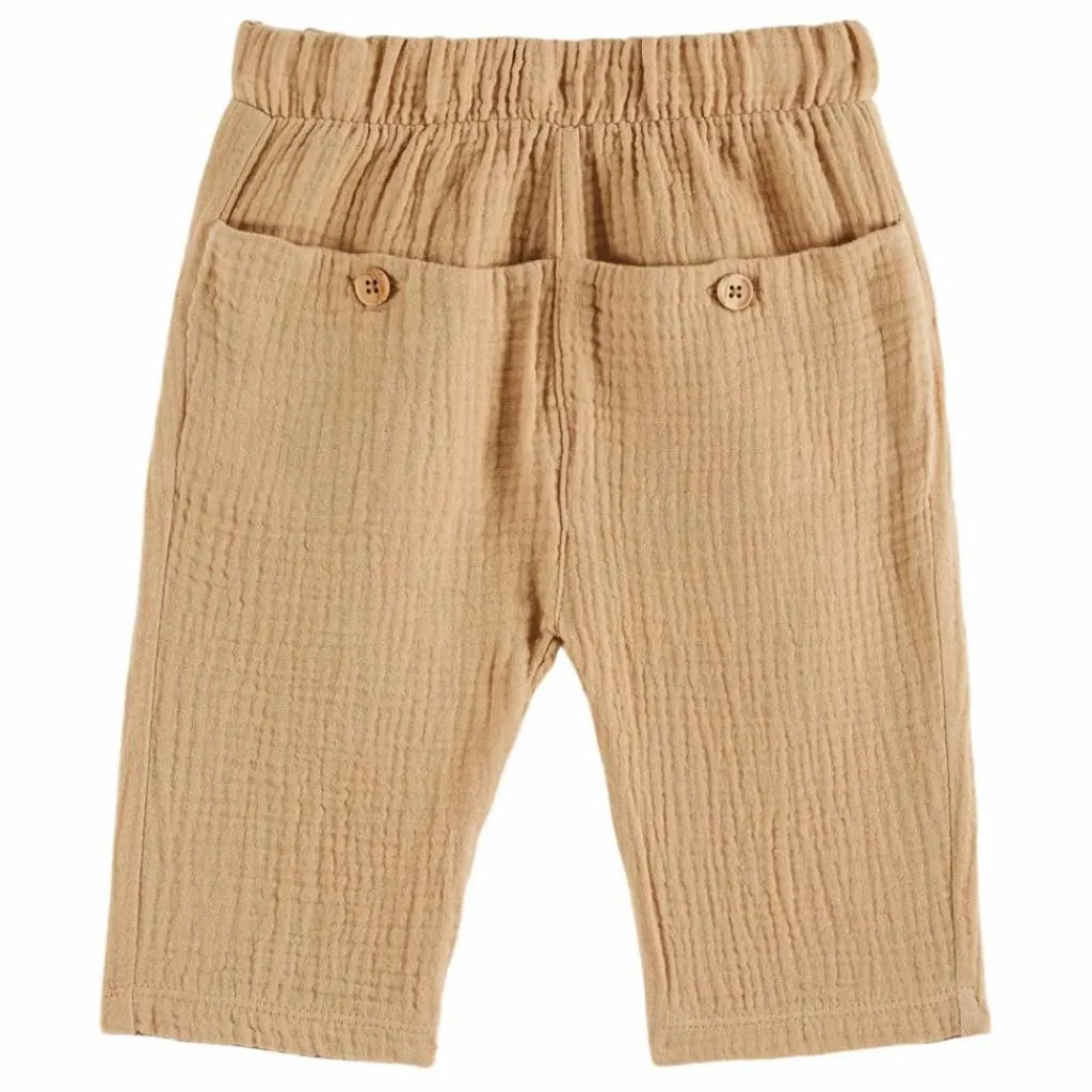 Le pantalon est monté sur une large ceinture élastiquée qui ne serrera ni ne marquera la taille de votre bébé. Deux poches sur toute la largeur du devant, fermées avec des boutons en bois, lui confèrent toute son originalité et vous permettront d’y glisser une tétine ou un petit doudou.