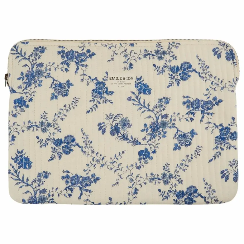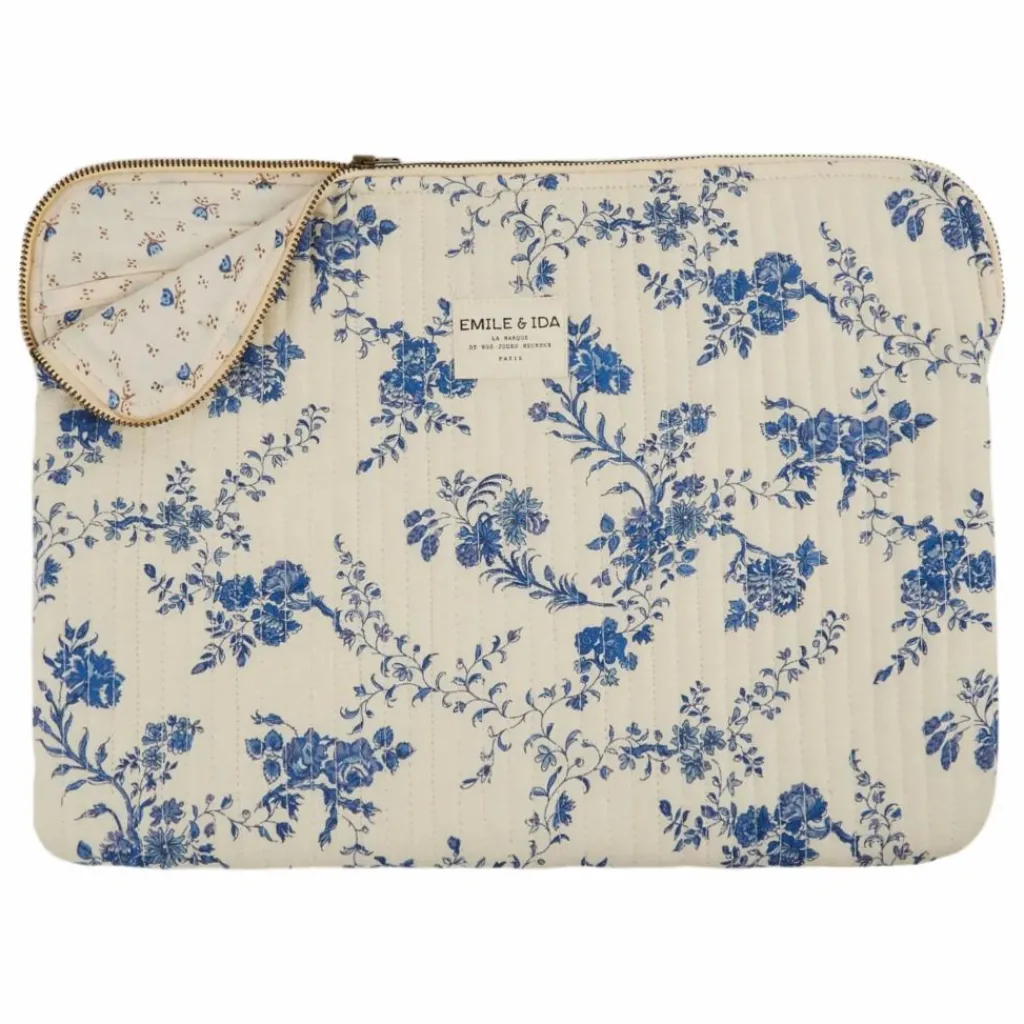 - Pochette d’ordinateur écrue en coton molletonné, parsemé de fleurs bleues.