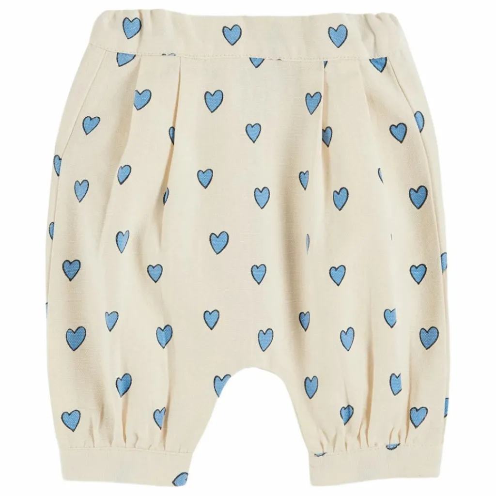 - Sarouel en toile de coton blanc cassé, saupoudrée de petits cœurs bleus. Glisser son bébé dans ce pantalon le transforme immédiatement en bébé d’amour irrésistible ! La forme sarouel accueille confortablement les petites fesses rebondies, comme nous l’ont rapporté les bébés qui l’ont essayée. Dans le dos, pour s’ajuster à tous les tours de taille, un élastique à bouton coulisse dans la ceinture ajoutée et une poche plaquée anime les fesses. Sur le devant, des plis couchés offrent un volume suffisant pour tous les bidons. Le bas des jambes est resserré sur les chevilles afin que le vent ne s’engouffre pas et ne refroidisse pas vos bébés.