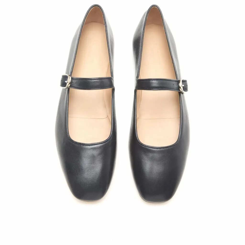 - Mary Jane, fabriquée à la main en cuir noir avec fermeture à boucle, semelle intérieure en cuir de veau matelassé et passepoil en cuir. Talon de 10 mm. Fabriquées en Italie.