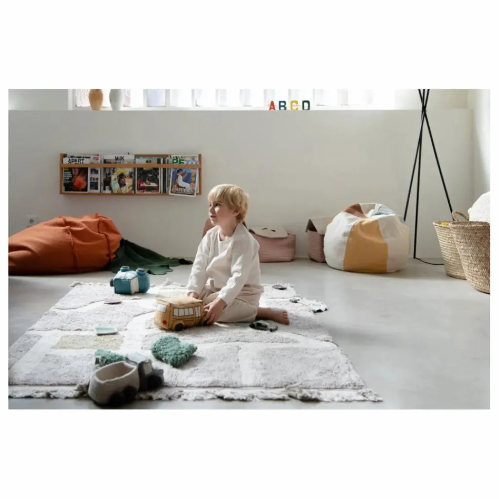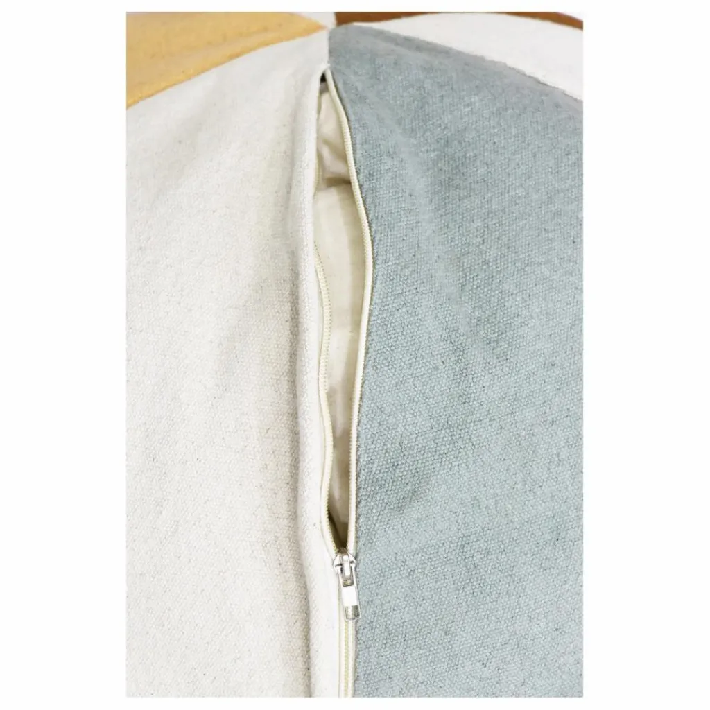 - Un pouf doux, moelleux et léger en forme de ballon de plage, associant des patchs de toile aux couleurs Naturel, Bleu Vintage, Miel et Toffee.