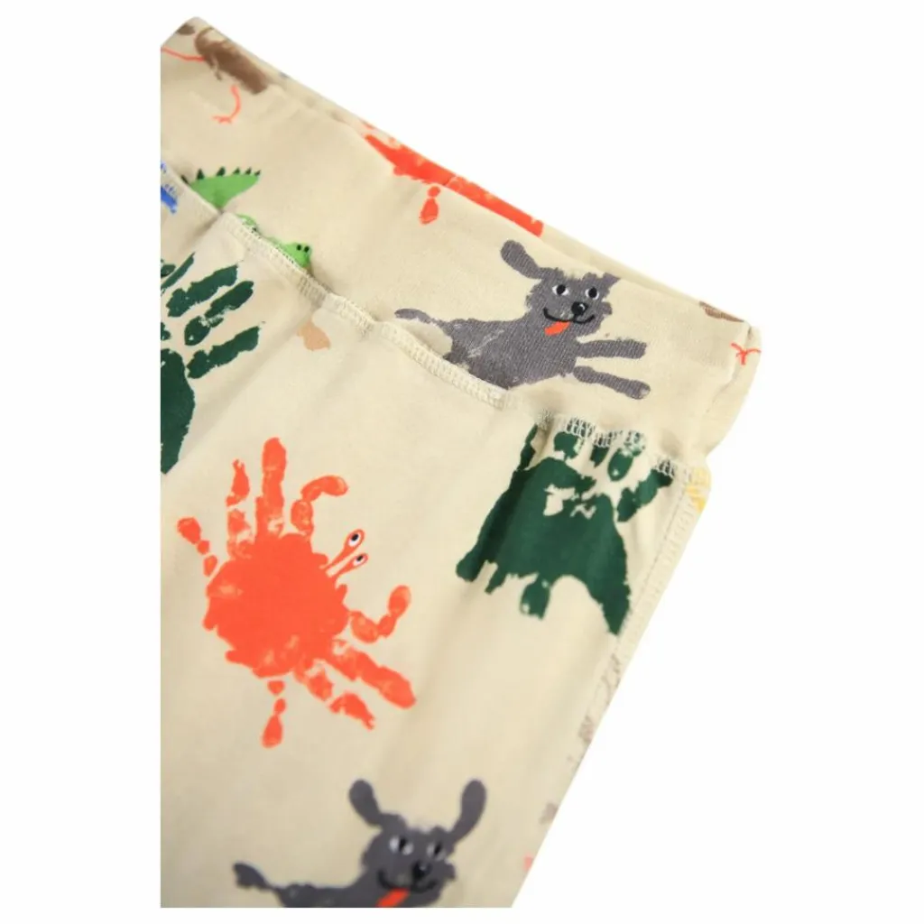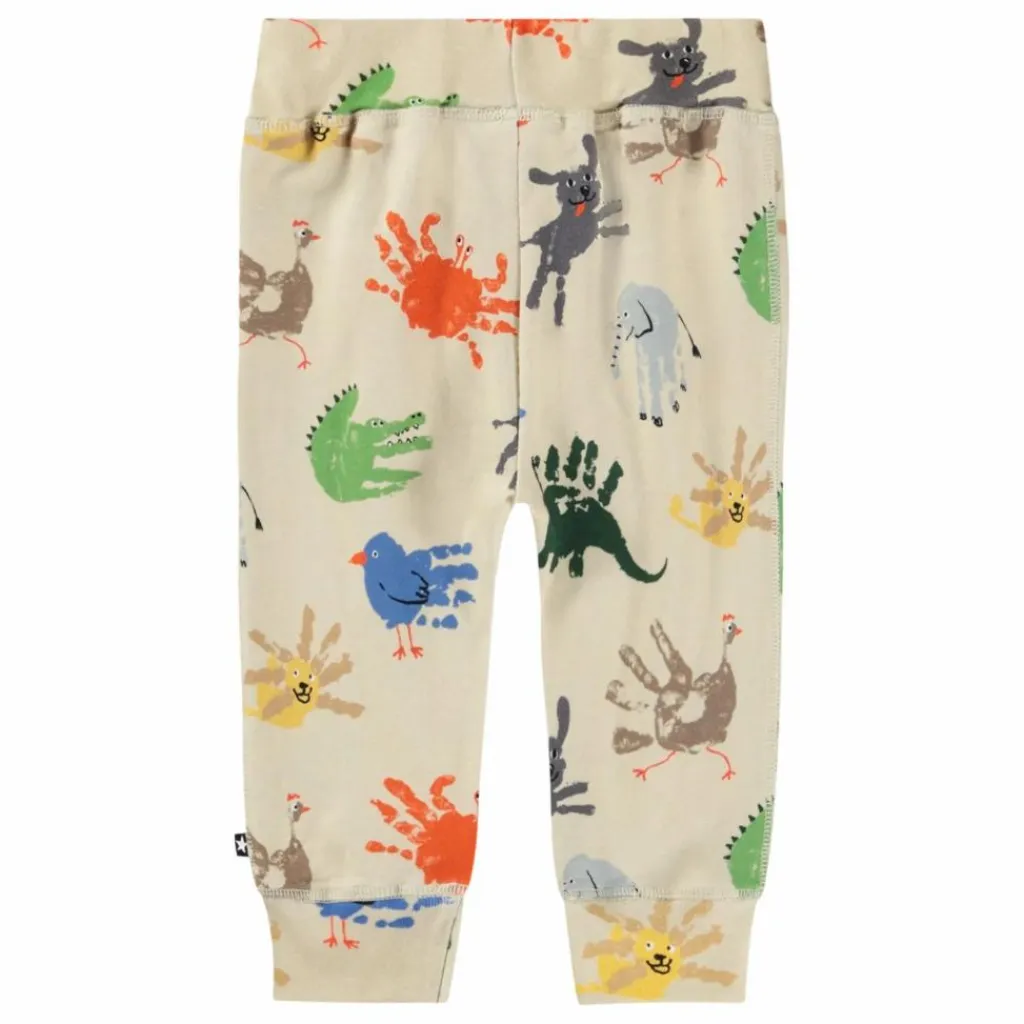 - Ce pantalon beige de Molo est fabriqué en jersey de coton biologique et présente un imprimé d’empreintes de mains colorées ressemblant à des animaux. Le pantalon est doté d’un large élastique à la taille et aux ouvertures des jambes.