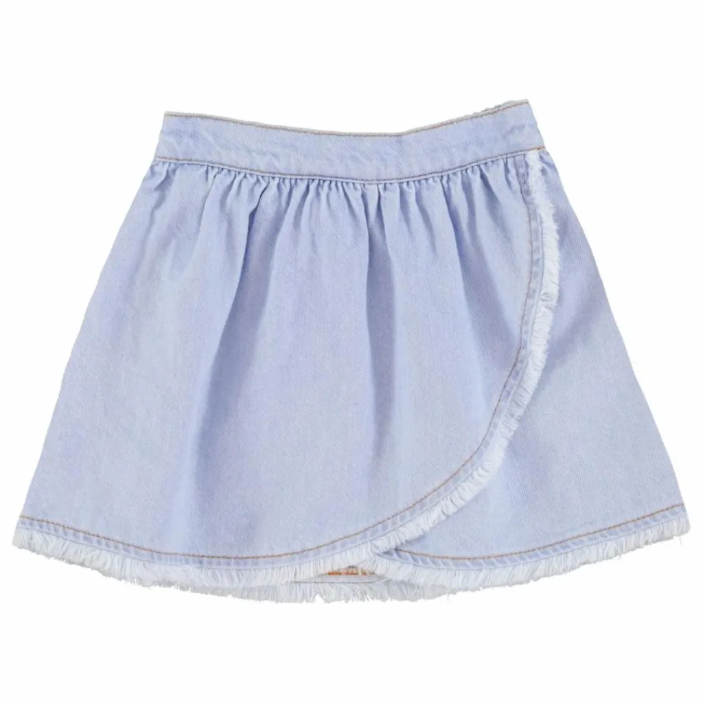 - Jupe courte en denim souple, croisée sur le devant et bordée de franges.