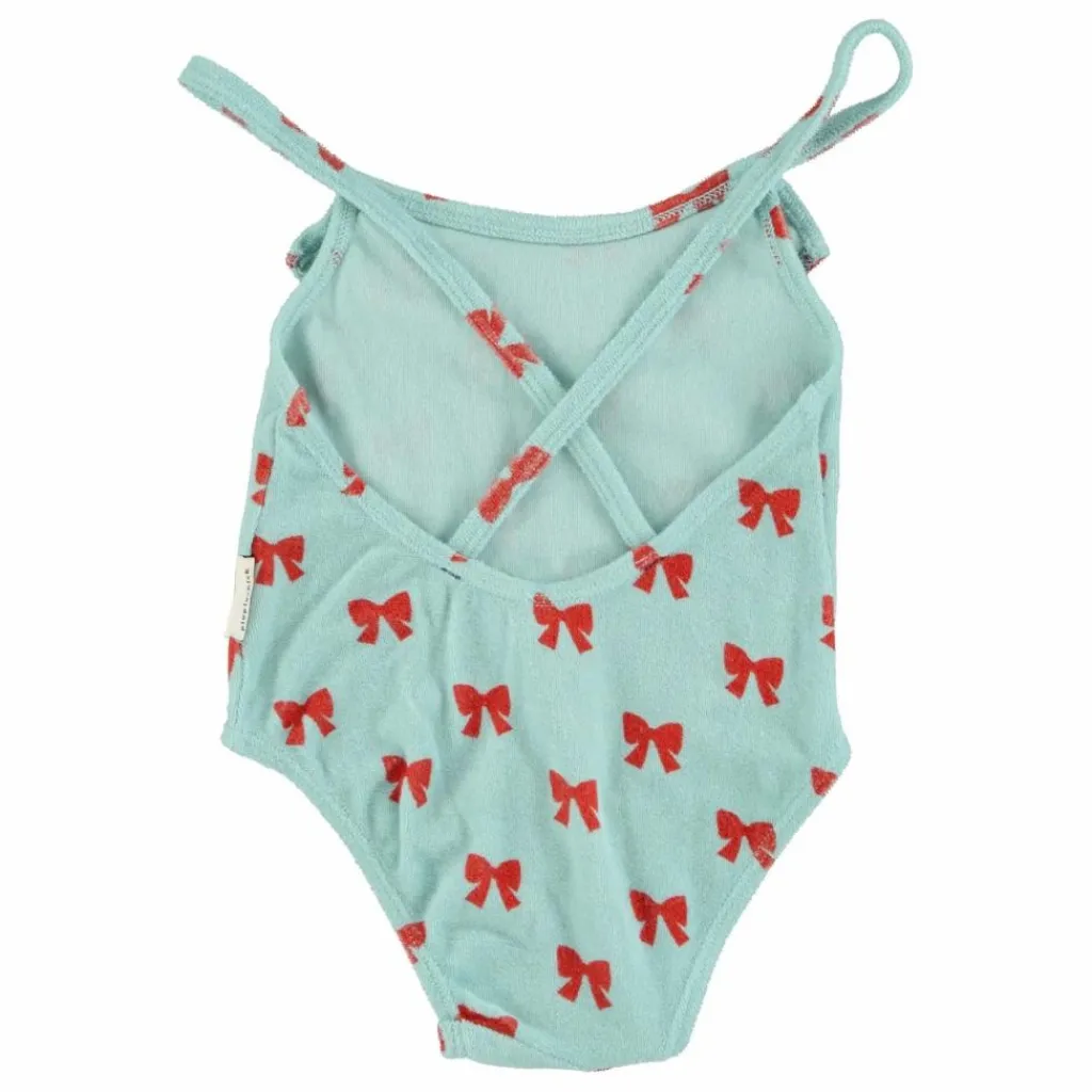 - Maillot de bain à fines bretelles. Volant sur la poitrine et imprimé sur le devant. Bretelles fines croisées dans le dos.