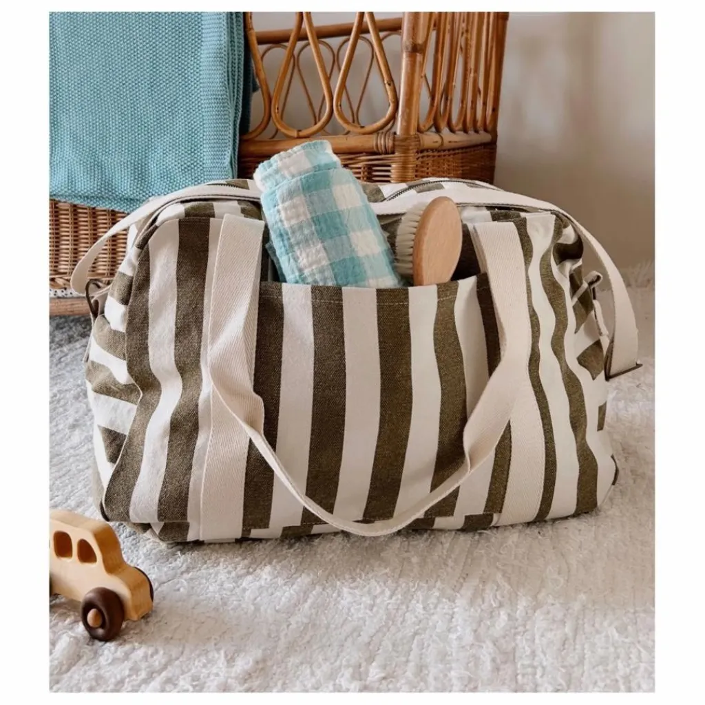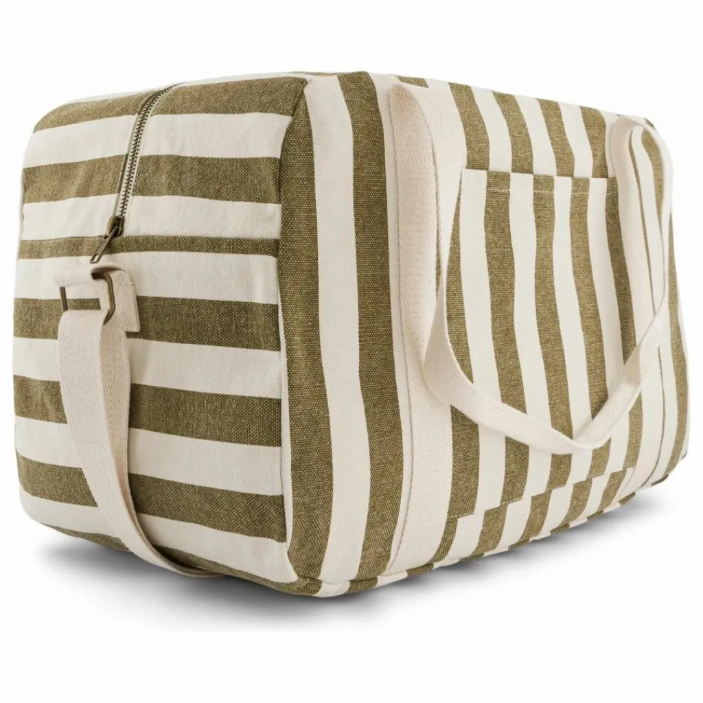 - RAPHAEL SAC A LANGER OU SAC WE IMPRIME RAYURE OLIVE GREIGE FERMETURE ZIPPEE 2 ANSES + 1 BANDOUILLERE REGLABLE 2 POCHES PLAQUEES EXTERIEURES 3 POCHES PLAQUEES INTERIEURES EXTERIEUR: COTON INTERIEUR: COTON ENDUIT