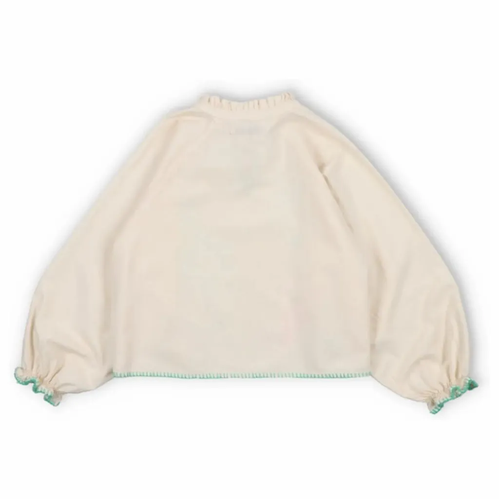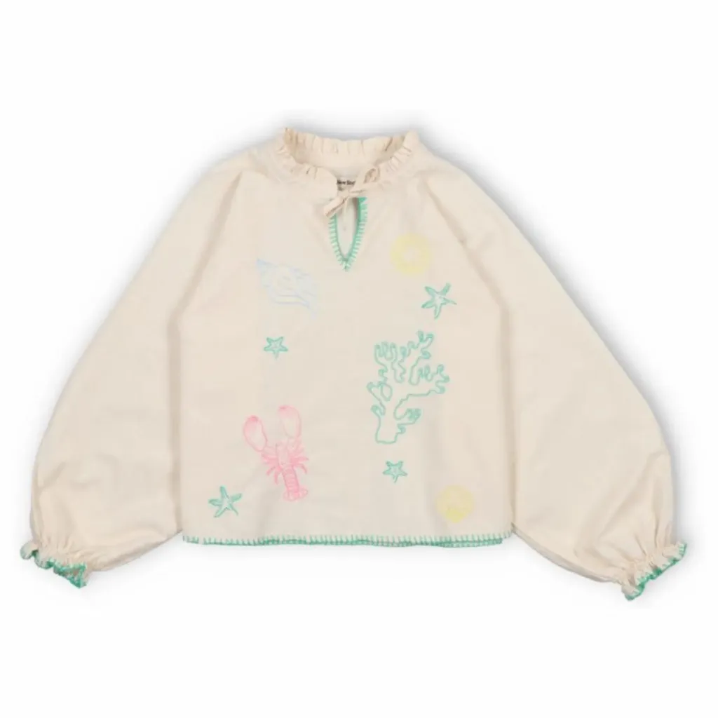 - Chemisier Kostas en tissu 100 % coton. Chemisier avec col à volants et nœud, col en V, manches bouffantes et broderies caractéristiques de la collection.