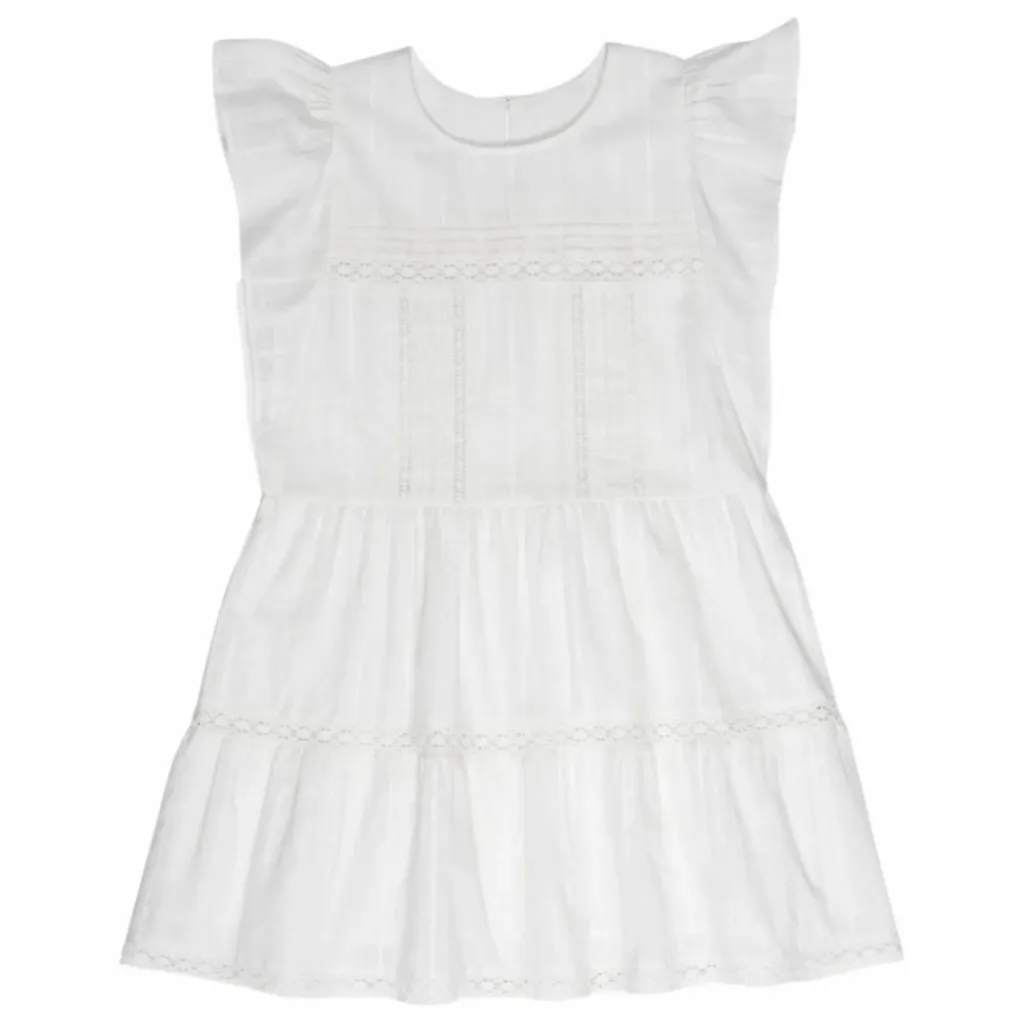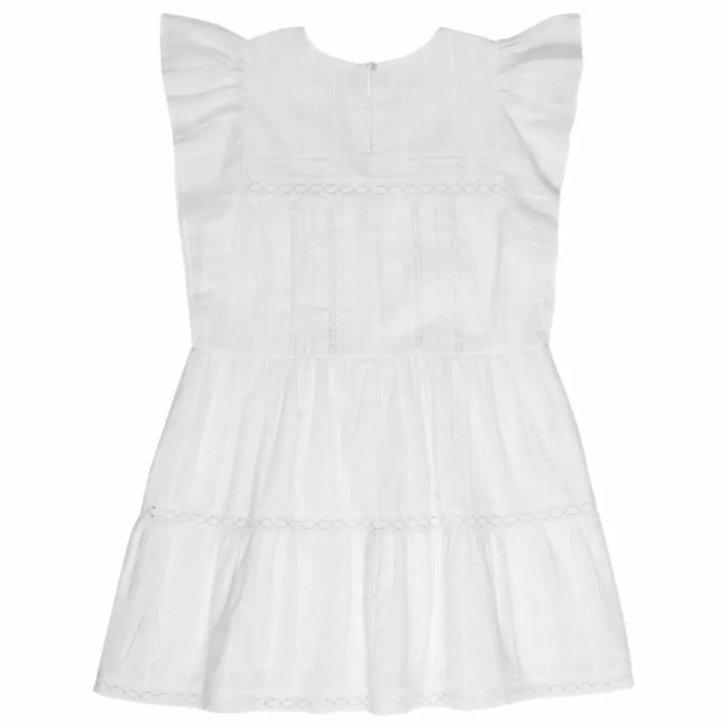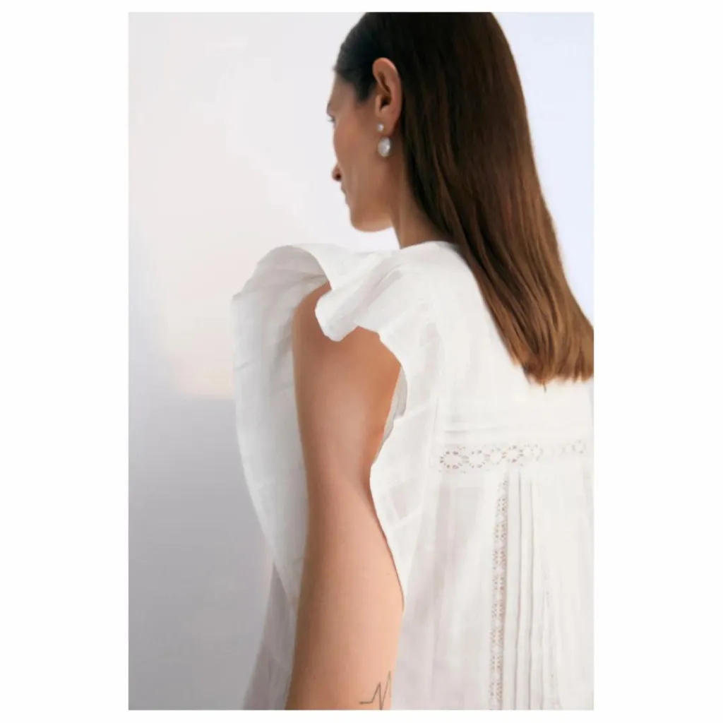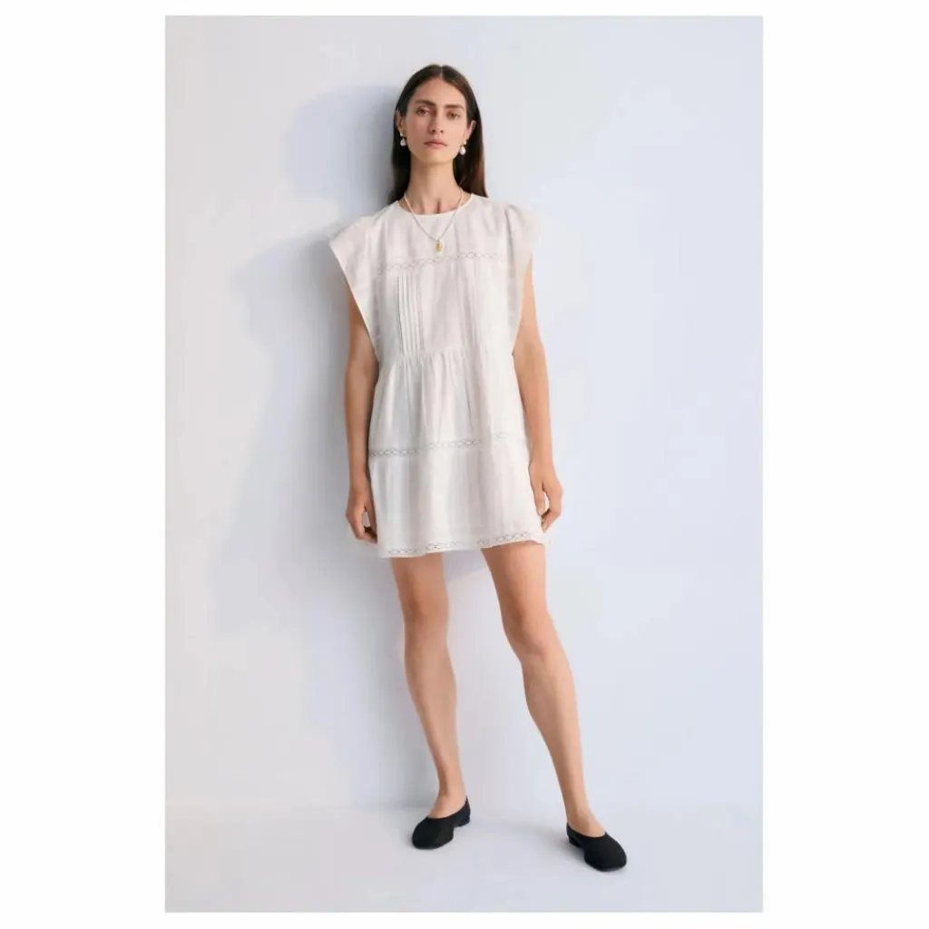 - Robe courte en tissu jacquard et détails en dentelle. Elle présente des volants sur les manches et une ouverture au dos avec un bouton en nacre.