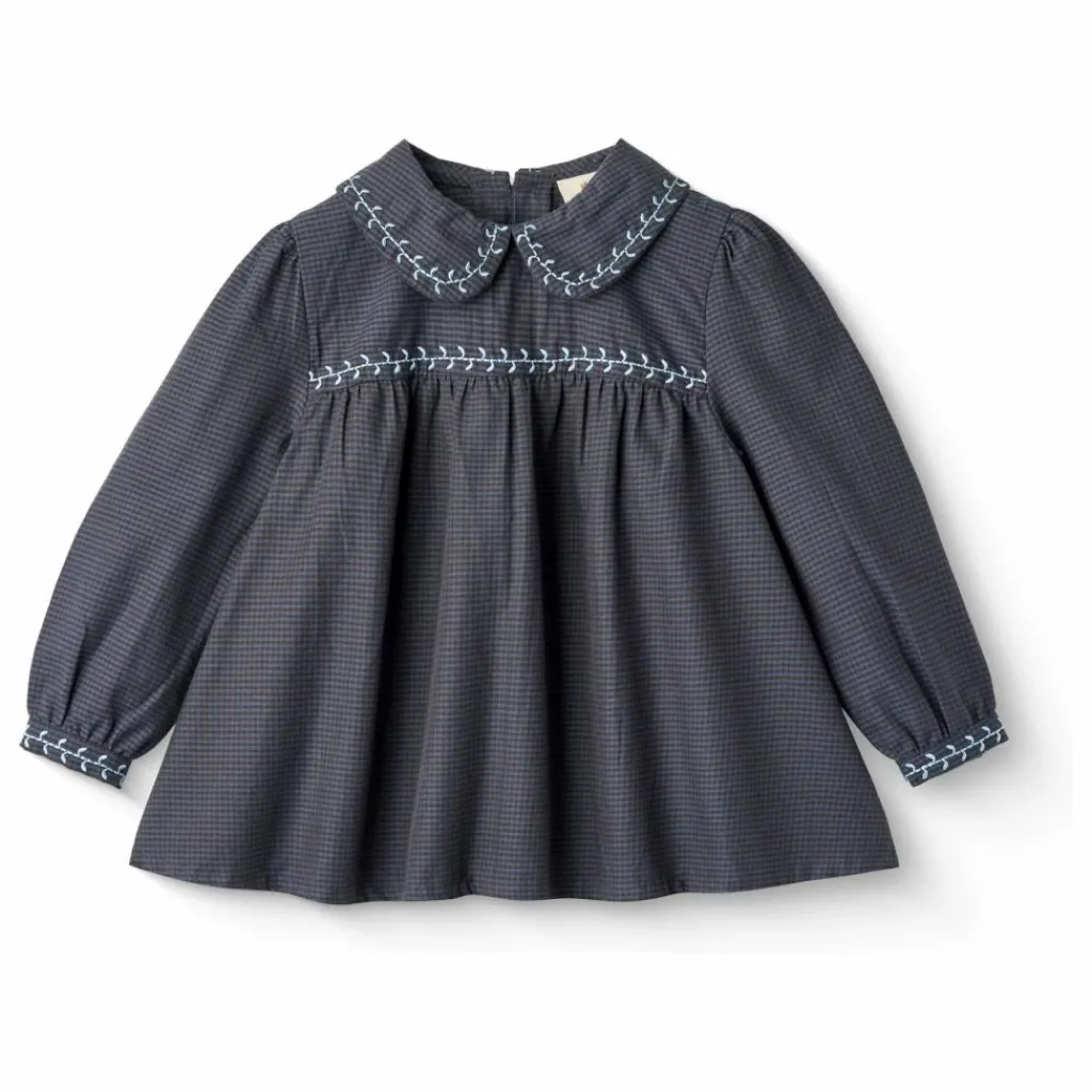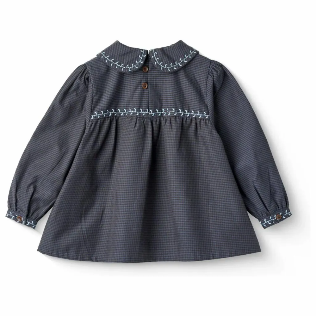 - Ce chemisier est doté d’un col à l’encolure et de détails brodés. La blouse à carreaux est fabriquée en 100 % coton biologique.