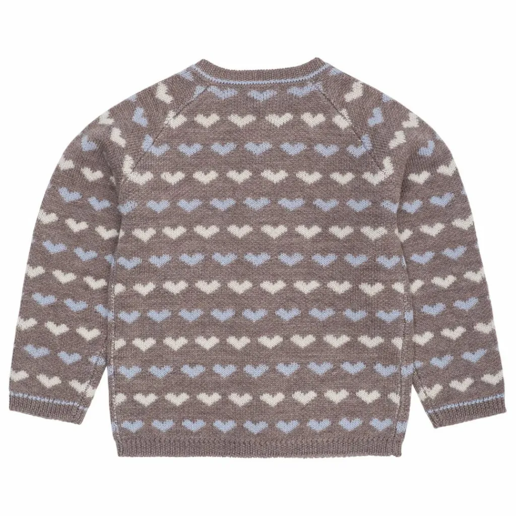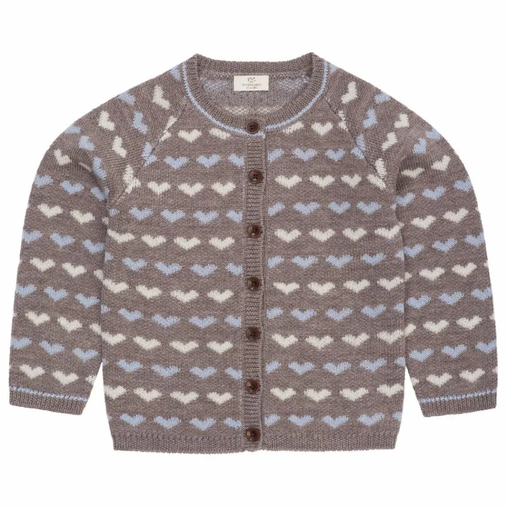 - Ce cardigan a des manches longues et un col rond. Le cardigan a des petits cœurs tricotés et est fait à 100% de laine mérinos.