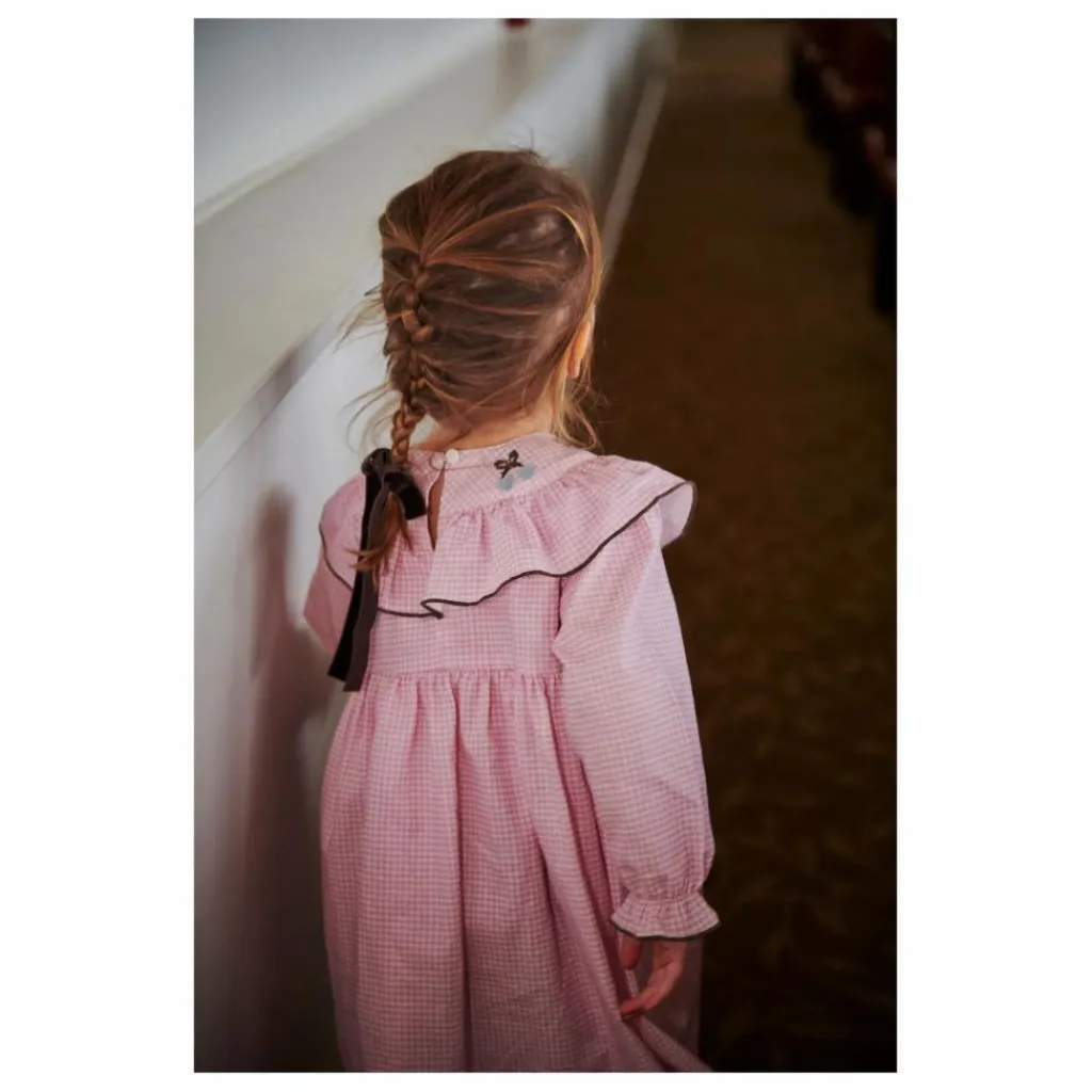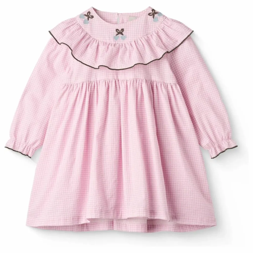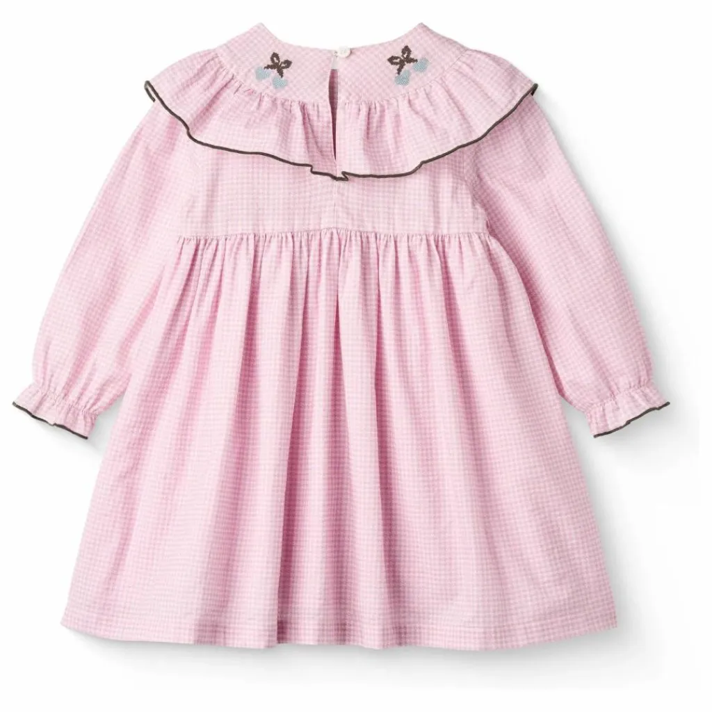 - Cette robe a des volants au col et un beau motif sur le devant de la robe. La robe est fabriquée en 100% coton biologique