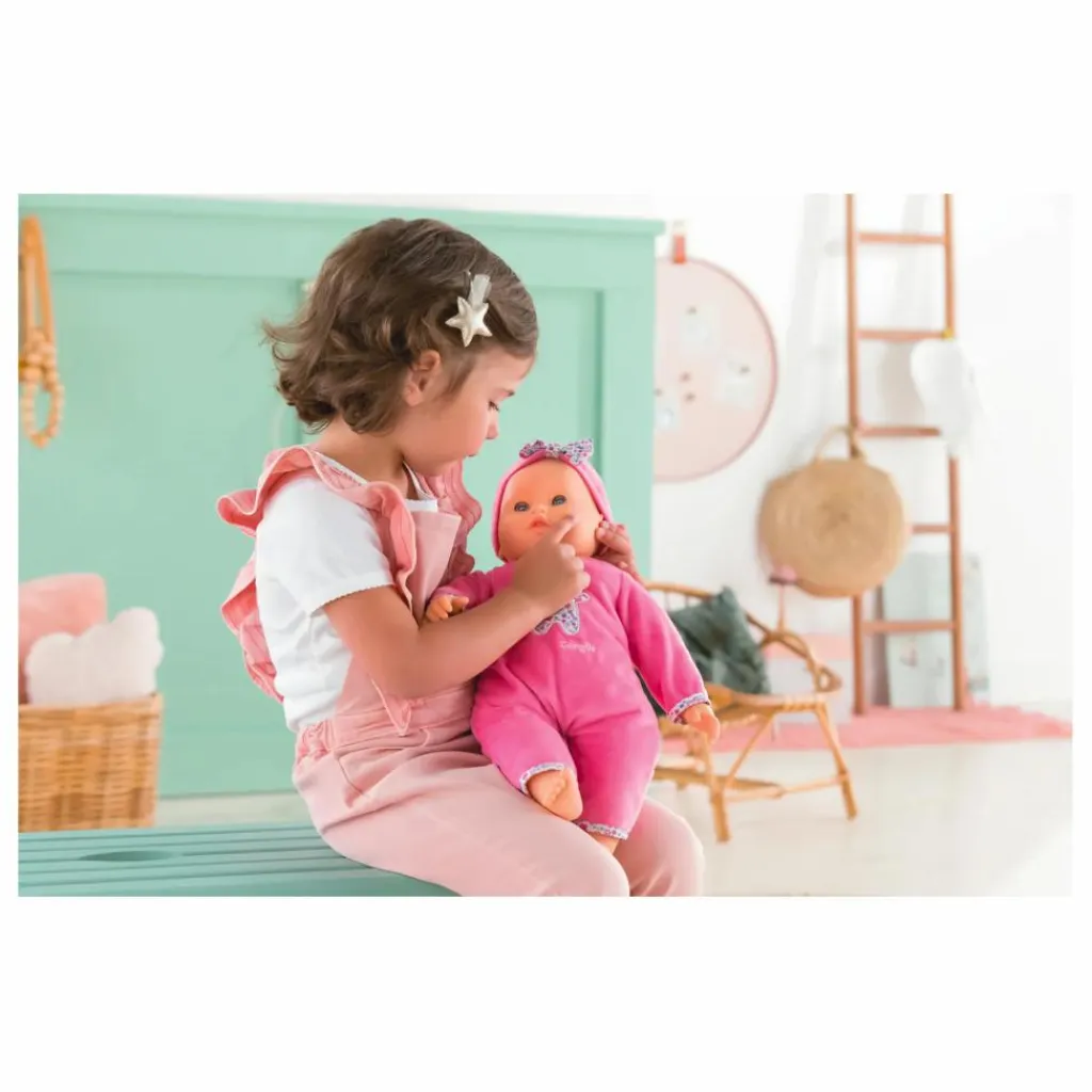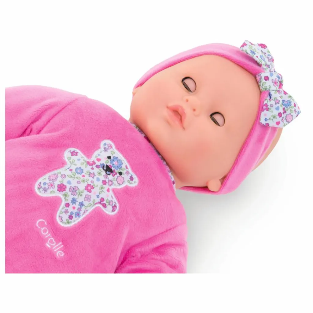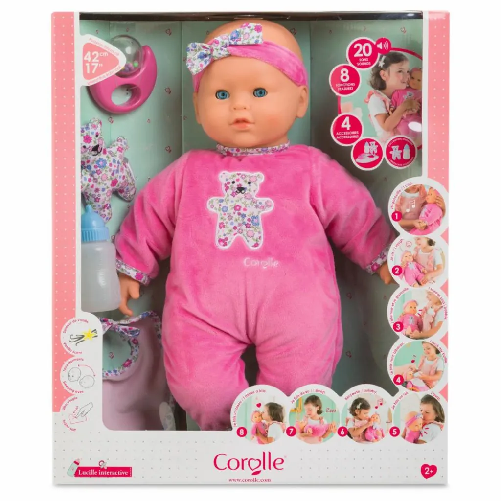 - Détails : Visage délicatement parfumé à la vanille., Adapté aux petites mains, Emet 20 sons différents et possède 8 fonctions :, gazouille quand on appuie sur sa main gauche, rit quand on appuie sur son pied gauche, éternue ou fait des vocalises quand on effleure son pied droit, tète (bruit de succion) quand on lui donne son biberon, fait son rot quand on lui tapote le dos après avoir pris son biberon, si elle pleure, on peut la calmer en approchant son doudou de son ventre pour qu’une berceuse se déclenche, ou en la berçant dans nos bras pour qu’elle s’endorme, fait le bruit du bisou quand on approche sa joue de la nôtre ou qu’on la lui caresse, Fonctionne avec 3 piles AA (LR6) non fournies, 1 poupon(s), 1 pyjama, 1 bandeau, 1 bavoir, 1 hochet(s), 1 petit doudou ours interactif, 1 biberon interactif