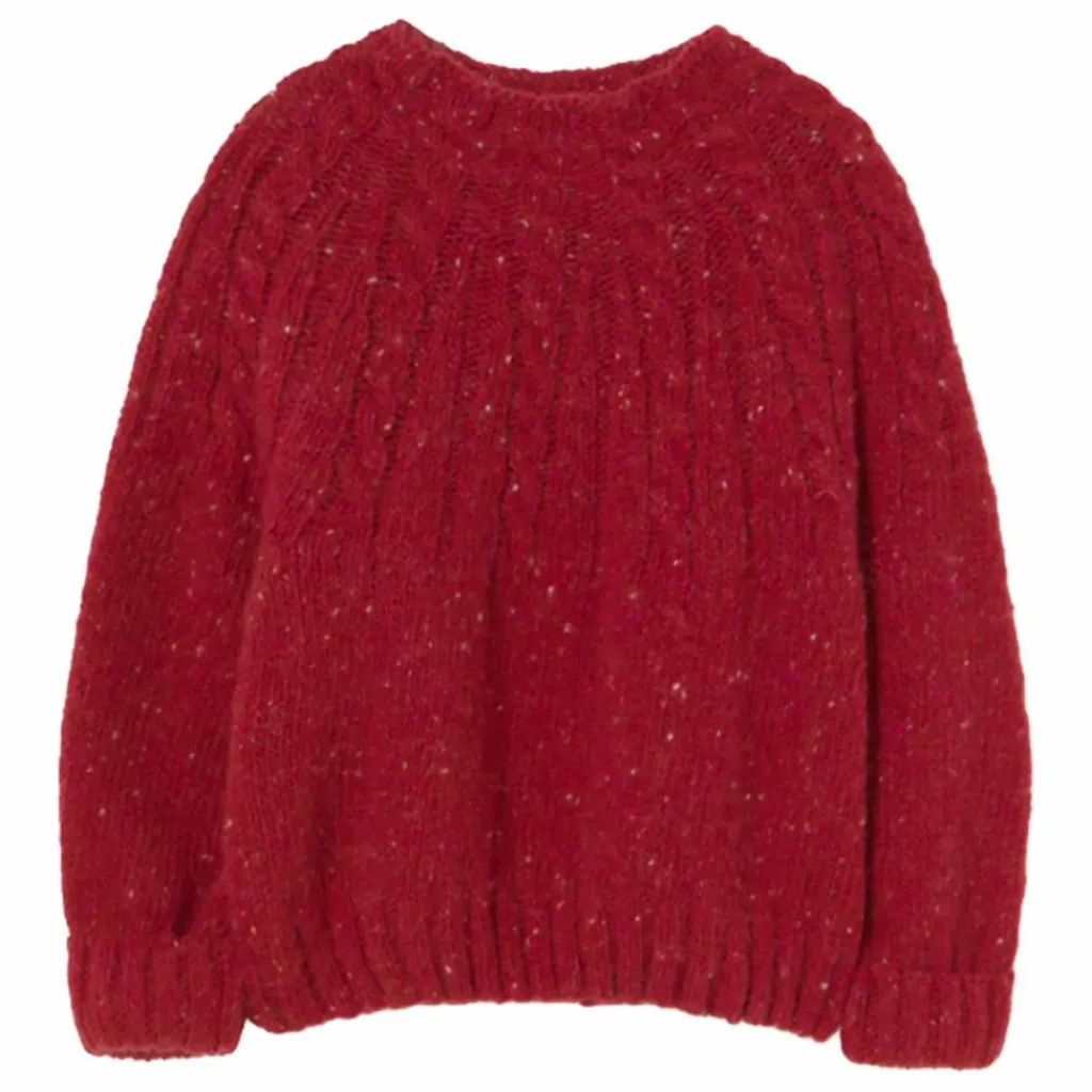 - Pull en tricot doux, moelleux et chaud, combinant les styles uni et tricoté. Encolure ras du cou. Manches raglan. Bordures en côtes aux poignets et à l’ourlet. Subtilement moucheté.