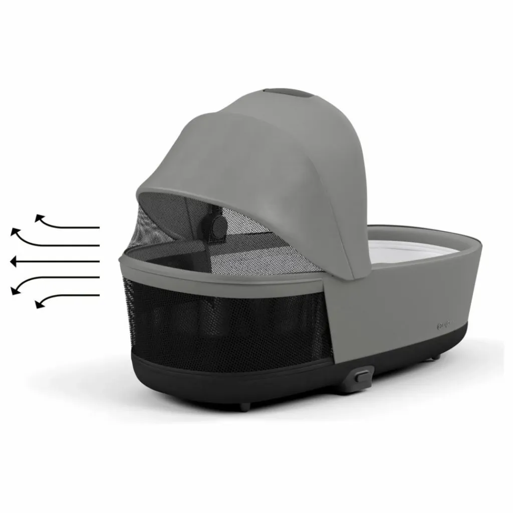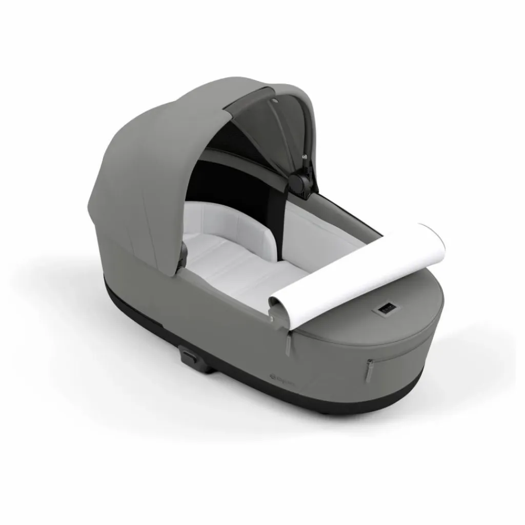 Nacelle Lux Carry Cot Priam : Extra large, Canopy pare-soleil avec protection solaire UPF50+, Poignée de transport intégrée, Visière extensible, Boutons mémoire, Fenêtres vue panoramique et vue ciel, Matelas respirant