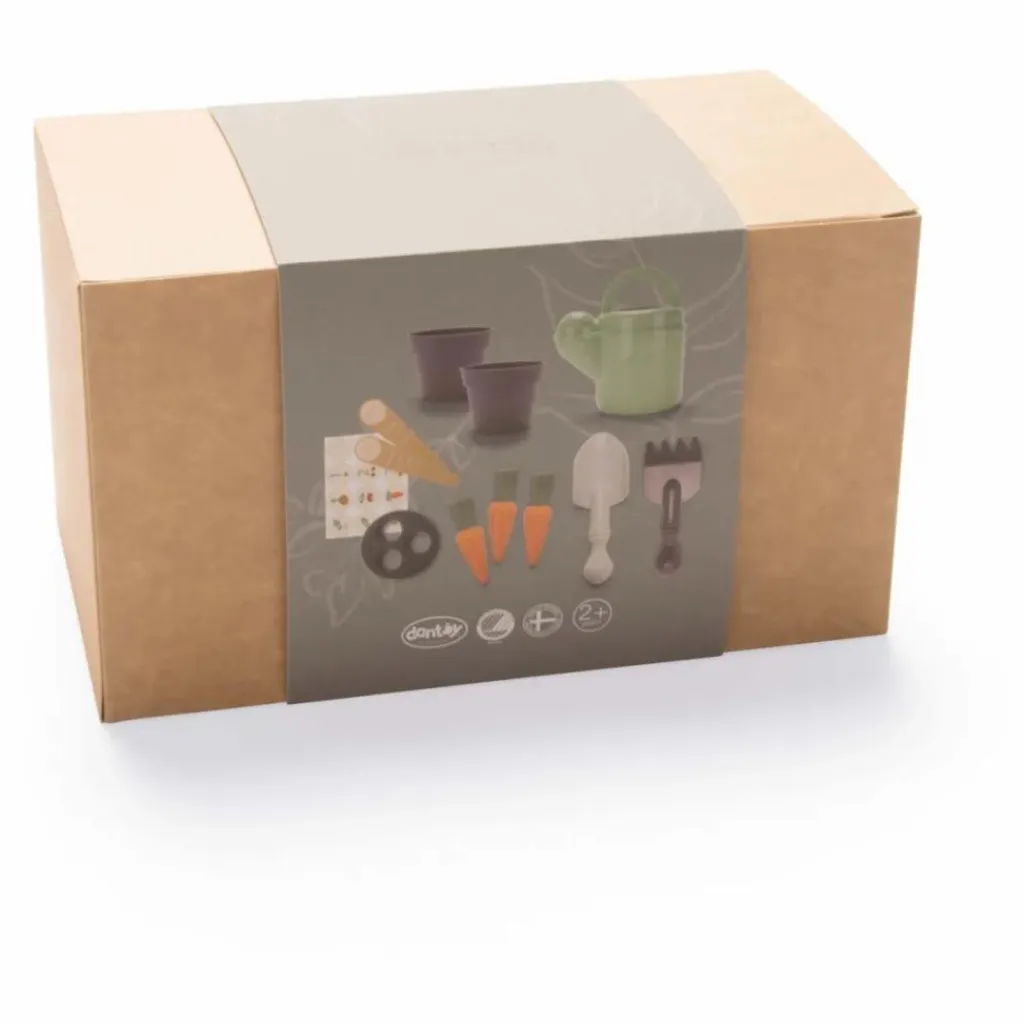 - 11 pièces : 1 arrosoir, 1 pelle, 1 râteau, 2 pots à jardiner, 3 carottes, 2 pancartes, 1 planche de stickers