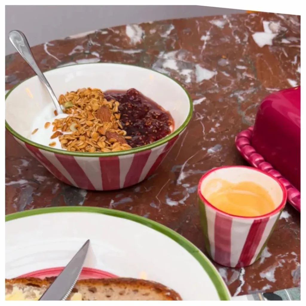 - Le bol Dakota reprend les lignes roses, rouges et vertes avec légèreté. Il donne un petit twist coloré aux repas sans en faire trop.