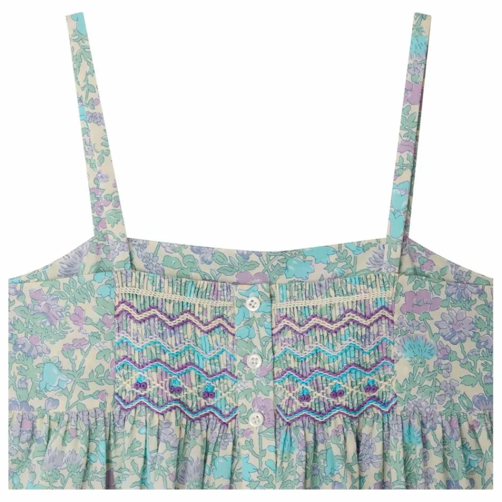 - La robe Passion pour fille revisite l’inimitable tissu Liberty aux jolies fleurs imprimées. Les smocks brodés main sur le buste illustrent le savoir-faire artisanal de la Maison. Cette robe en coton issu de l’agriculture biologique se dote de deux fines bretelles. Deux poches plaquées discrètes devant lui ajoutent de la praticité.