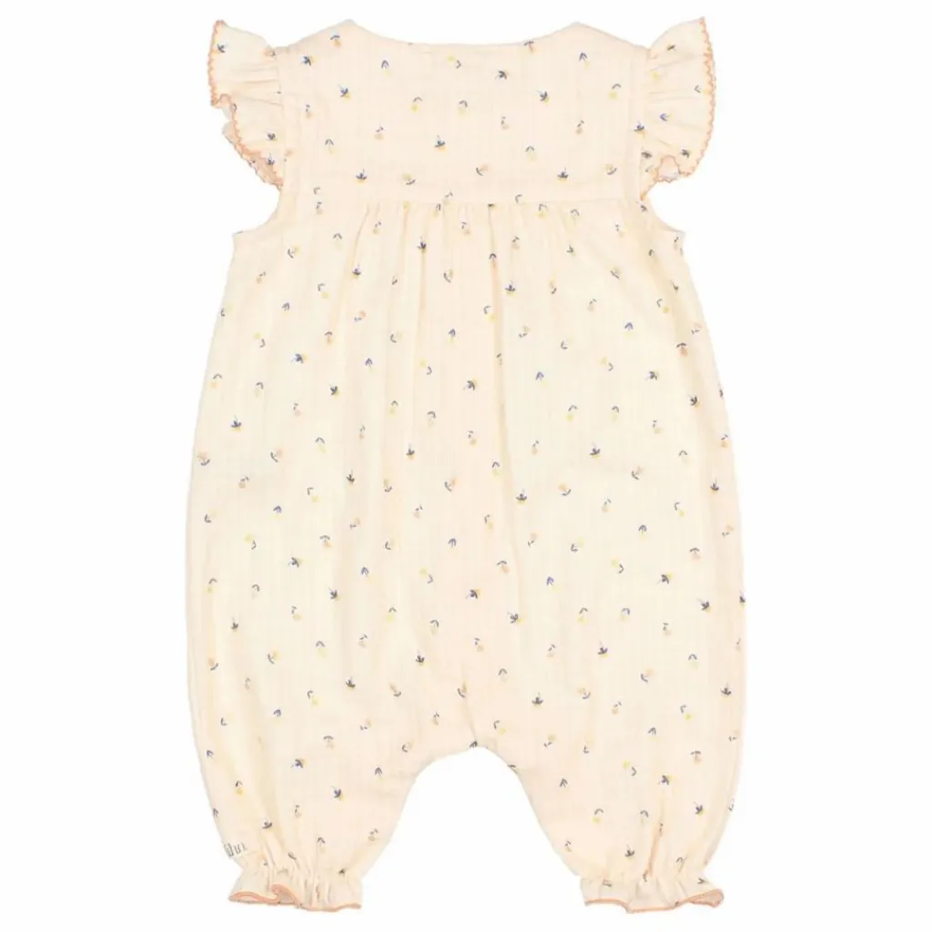 - Combinaison imprimée Petite fleur. Col rond. Bretelles volantées. Fermeture à boutons sur le devant. Boutons pression à l’entrejambe pour faciliter l’habillage. Elastique à l’ourlet.