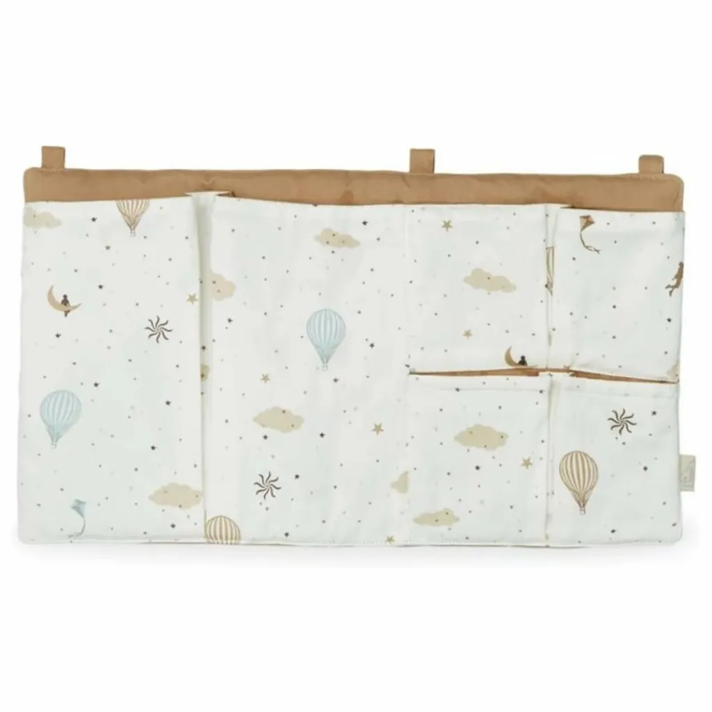 - Pratique et jolie pochette de lit à fixer sur le lit d’enfant pour garder à portée de main les tétines, les livres, les doudous et autres objets indispensables à l’endormissement. Pochette de lit en blanc et en marron.