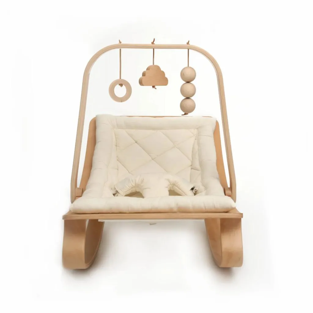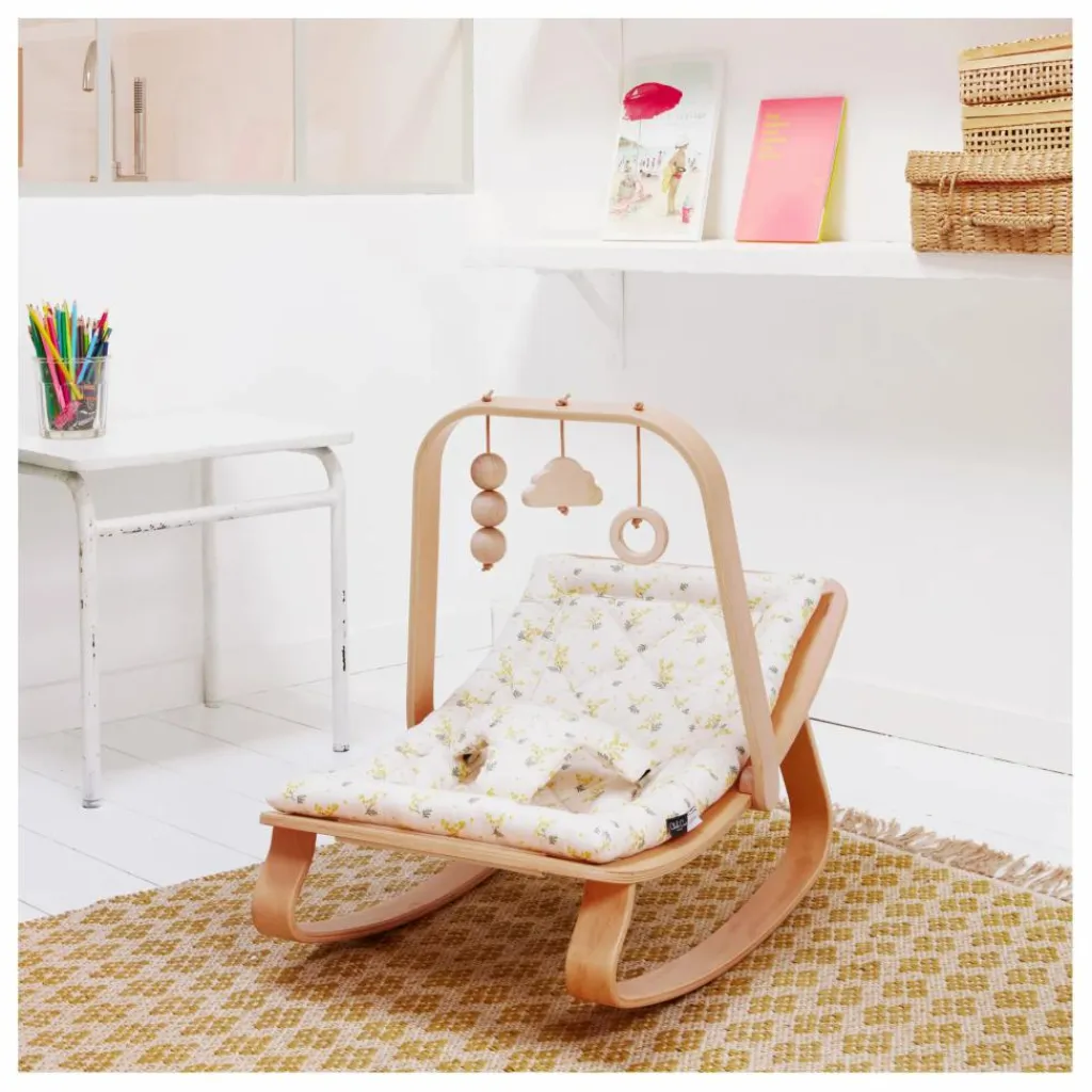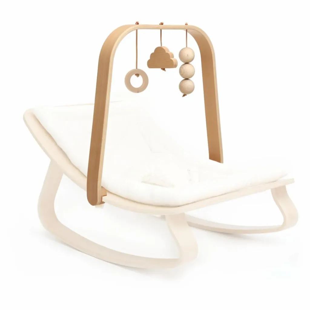 Votre tout petit pourra s’amuser des heures dans son transat grâce à cette arche, ornée de jouets en bois.