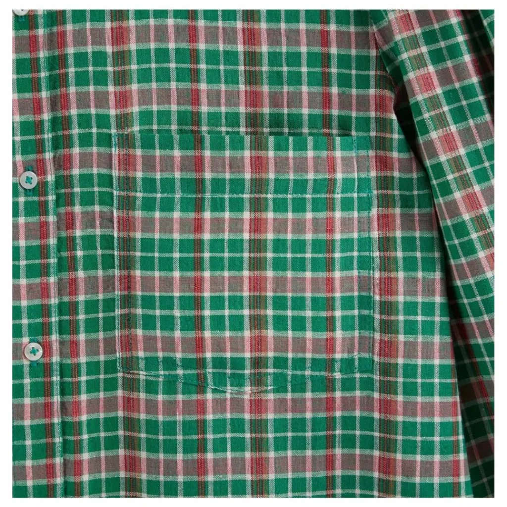 - Chemise en khadi de coton vert quadrillé de lignes écrues et rouges dont la coupe over-size s’inspire des chemises d’homme.