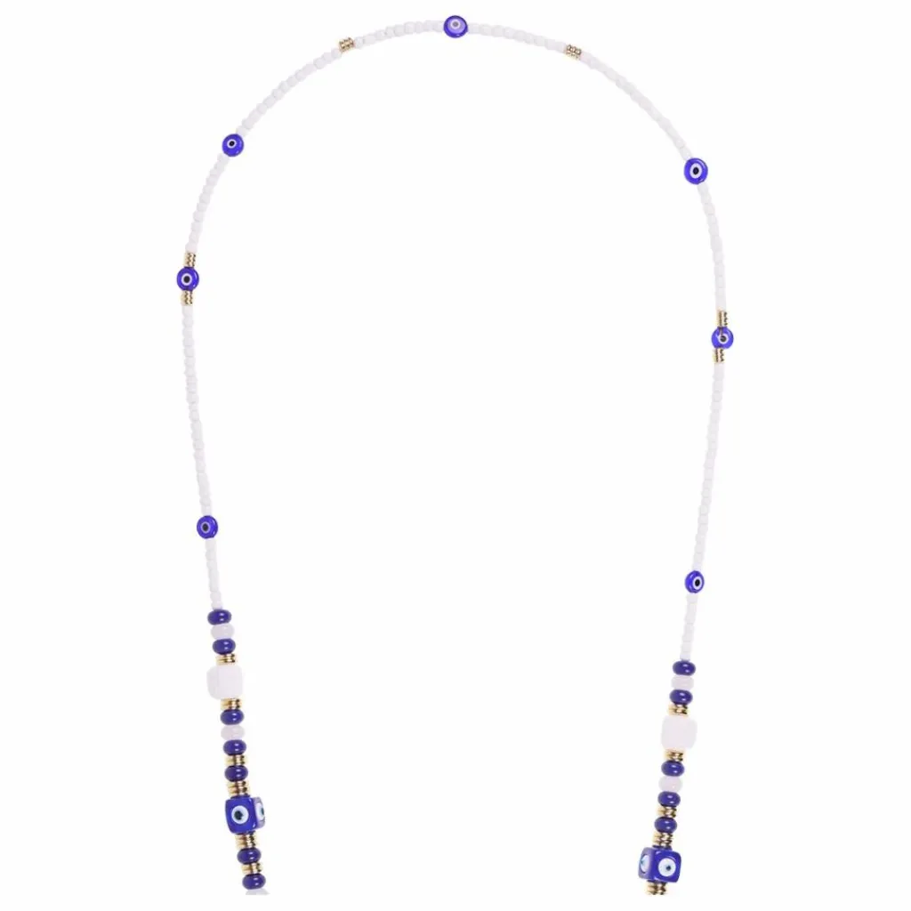 - Notre chaîne de téléphone Filipa, en perles blanches, oeil de Mataki et pampilles dorées à l’or fin, longue de 120 cm, se clipse sur nos coques à anneaux ou notre adaptateur avec ses mousquetons dorés.