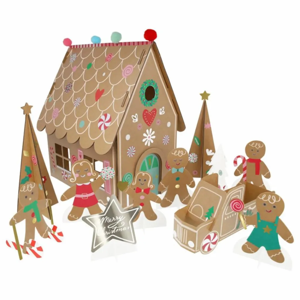 - La boîte plastifiée, décorée de détails dorés, contient 24 enveloppes de tailles différentes. En les ouvrant, découvrez une maison en pain d’épices à assembler, des personnages en pain d’épices, un camion en pain d’épices et des sapins en pain d’épices – tous faciles à emboîter. Les enveloppes renferment également des pompons en laine, une étoile argentée « Merry Christmas » et 11 planches d’autocollants variés pour décorer la scène.