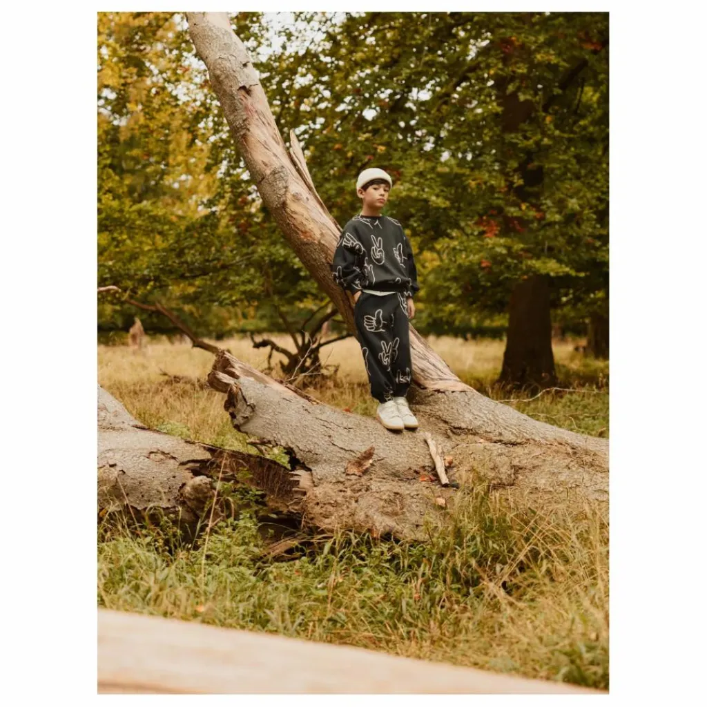 - Ce pantalon de survêtement noir de Molo est fabriqué en coton biologique et comporte une taille élastique, un cordon de serrage intérieur, un élastique au niveau des chevilles et des poches latérales. Le pantalon de survêtement a une coupe régulière et est décoré d’un imprimé blanc représentant divers signes de la main.